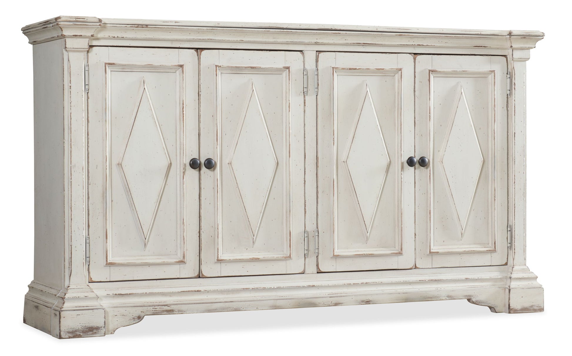Perfect for decors ranging from coastal to cottage to farmhouse to classic, the Four-Door Cabinet has a relaxed textured white painted finish and a carved diamond motif on each of the doors. Two removable wood shelves. Ships ready to assemble.