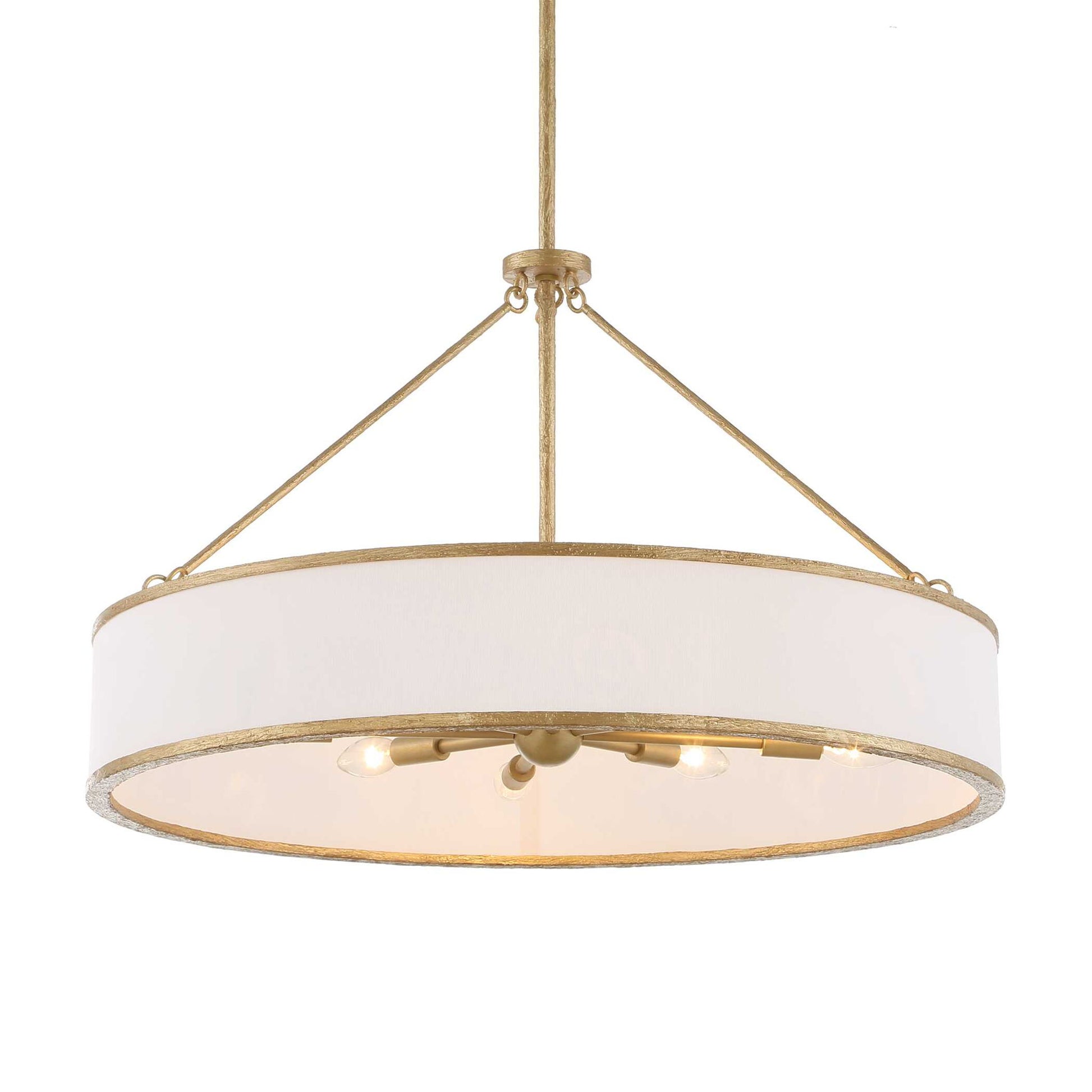 Narrow Hardback White Linen Fabric Hanging Shade With A Heavy Textured Soft Gold Finish. 8-40 Watt Max, Candelabra Sockets. Bulbs Not Included. Supplied With 15' Wire, 3-12" Stems,and 1-6" Stem For Adjustable Installation