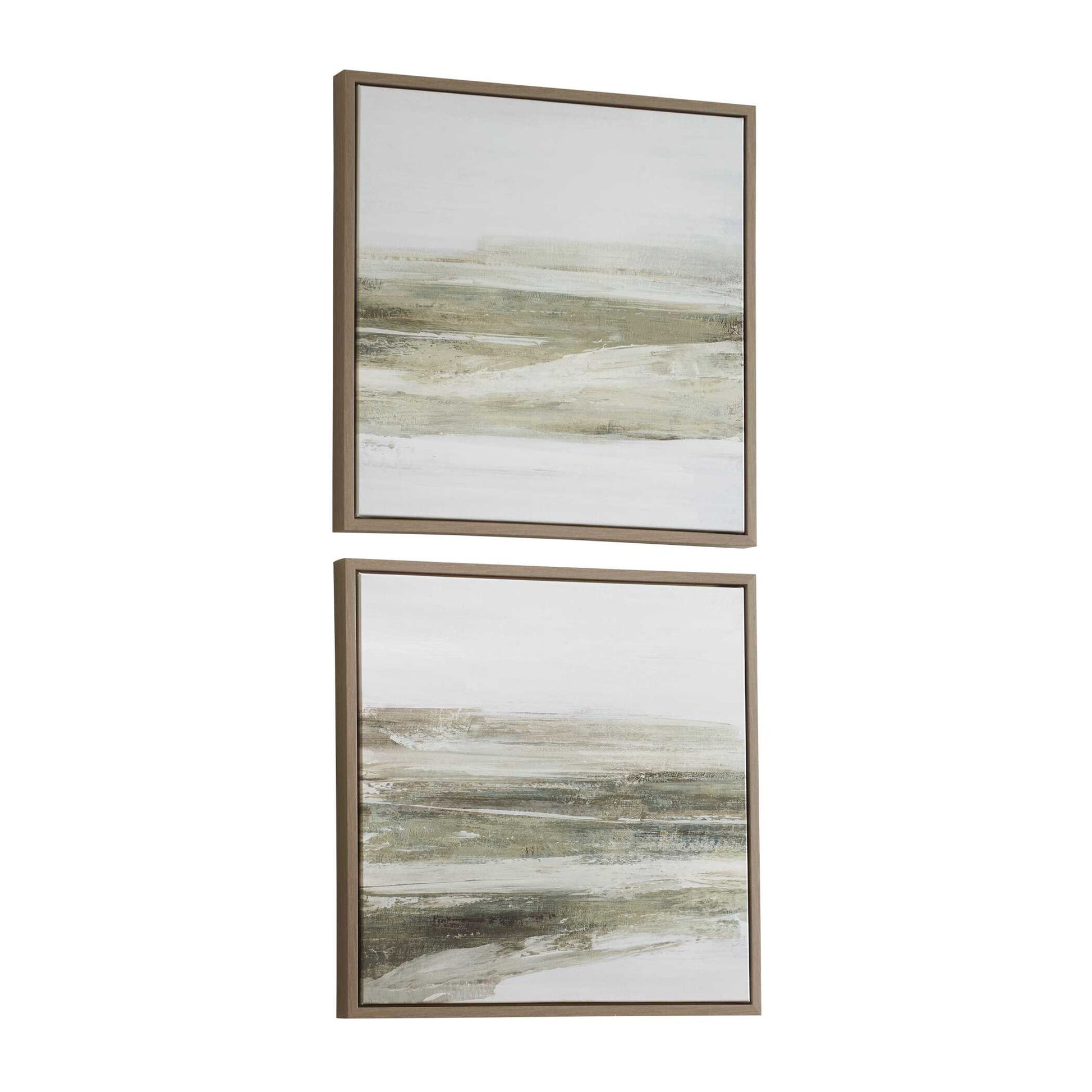 Capturing The Tranquil Essence Of A Horizon, This Pair Of Abstract Canvases Features A Soft, Earthy Palette Of Cream, Green, And Brown Tones, With Layered Brushstrokes That Create A Calming Sense Of Depth And Movement. A Gallery Frame With A Light Oak Finish Completes The Artwork. Each Canvas Is Proudly Handcrafted And Printed In The USA. Artwork By PI Studio.