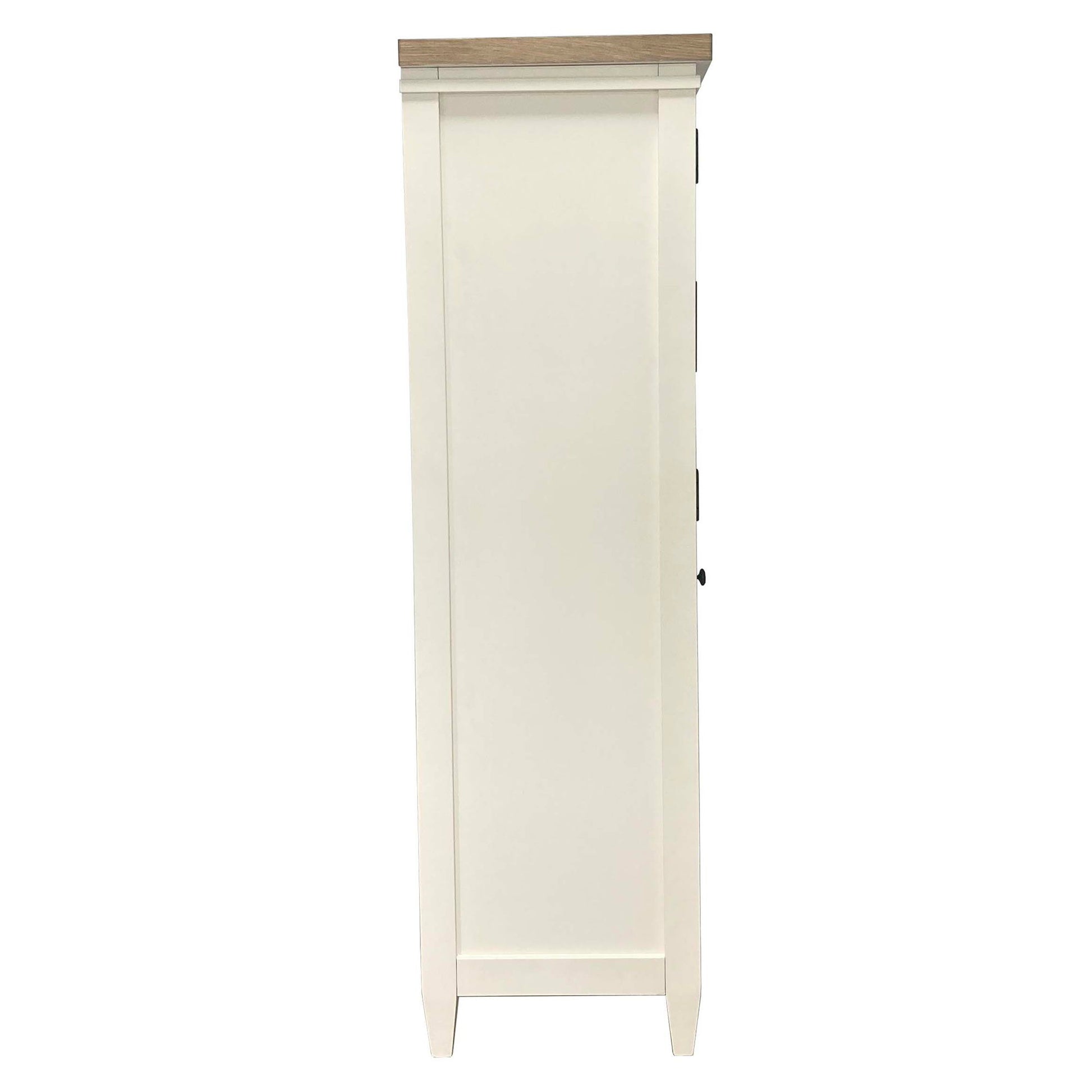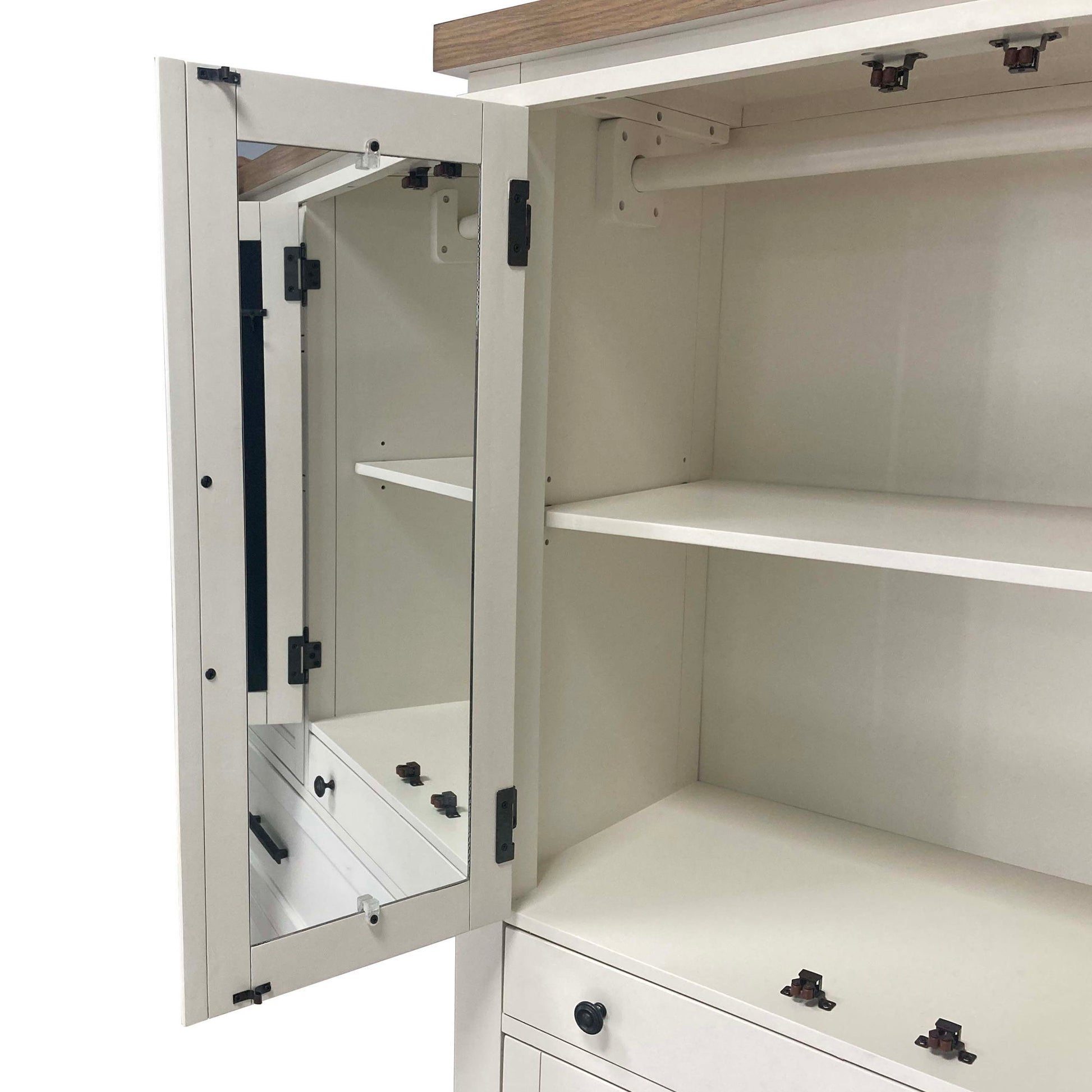 The Americana Modern 7 Drawer, 2 Door Chest is a stunning piece of furniture that brings timeless charm to your home. The fresh hand-painted Cotton finish with contrasting Weathered Natural top is beautifully complemented by the solid-metal custom hardware in authentic Burnished Bronze. Crafted from the finest materials, including poplar solids, birch veneers, and oak veneer tops, this chest is designed to last for years to come.