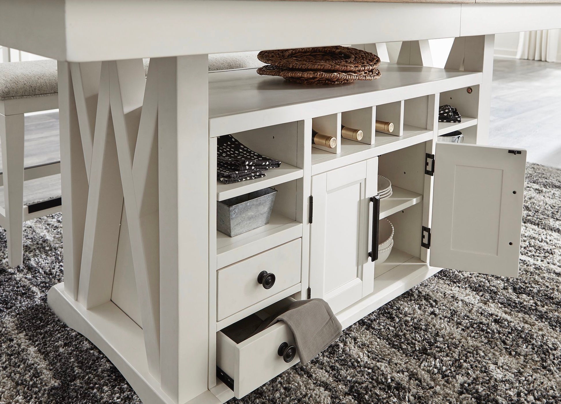 This dining set from our Americana Modern dining collection includes one counter height island table and upholstered counter height bar chairs, exuding casual comfort in everyday dining.