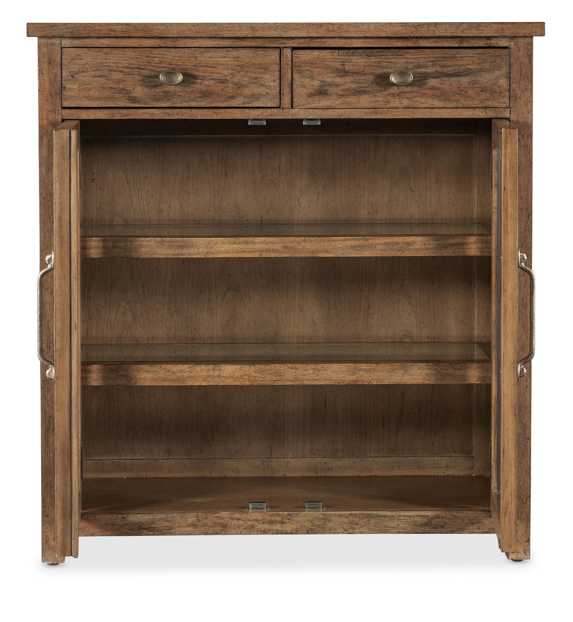Reimagining an historical design with a fresh take on finish, function and form, the Americana Pie Chest has two wood-framed seeded glass doors with magnetic catches and a light in the door area. Crafted of Oak Veneer, it is finished in the gentle warm Honey tone with distressing for authenticity. Measuring 40 inches high by 38 inches wide, it has two self-closing drawers and two adjustable wood framed tempered glass shelves with plate grooves. Metal alloy oval and bar pulls in an antique bronze finish.