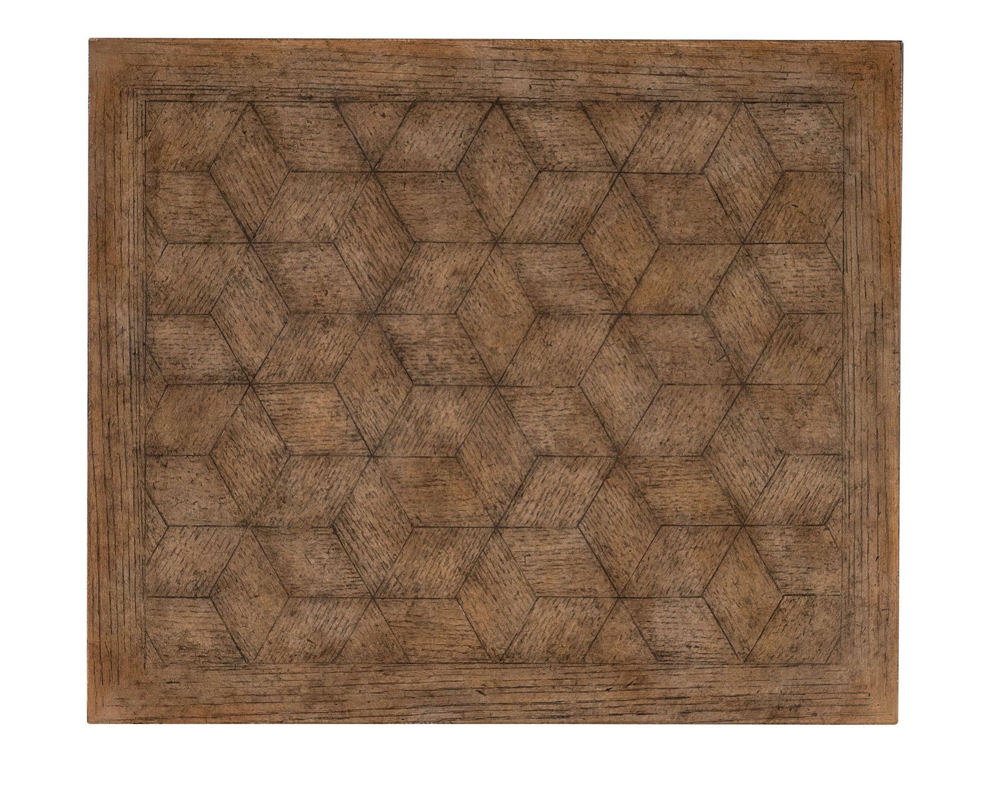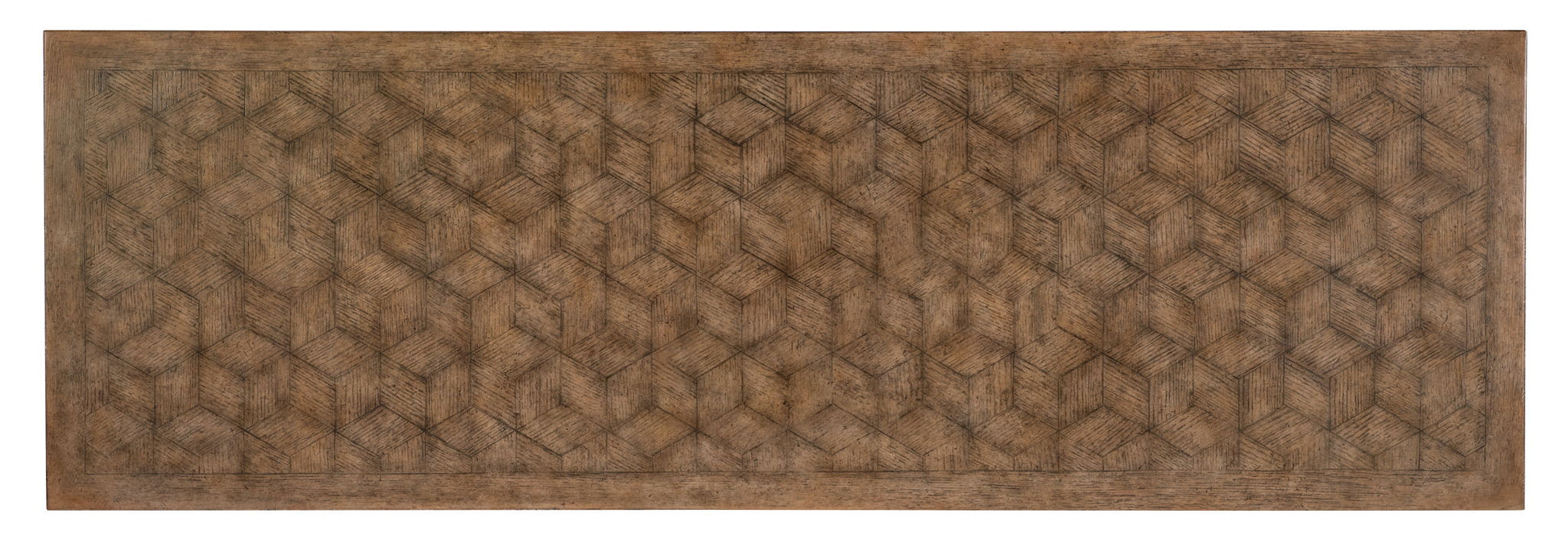 Reimagining an historical design with a fresh take on finish, function and form, the stunning Americana Trestle Console Table has a two-tone finish combining a parquet Oak Veneer top design with a Molasses finish on the base. Capturing the essence of a well-loved heirloom, the deep dark Molasses tone over Cathedral Oak Veneers adds warmth, while the variations in color reveal the natural beauty of the wood beneath. The base is an interlocked carved stretcher design. Solid-wood edge top.