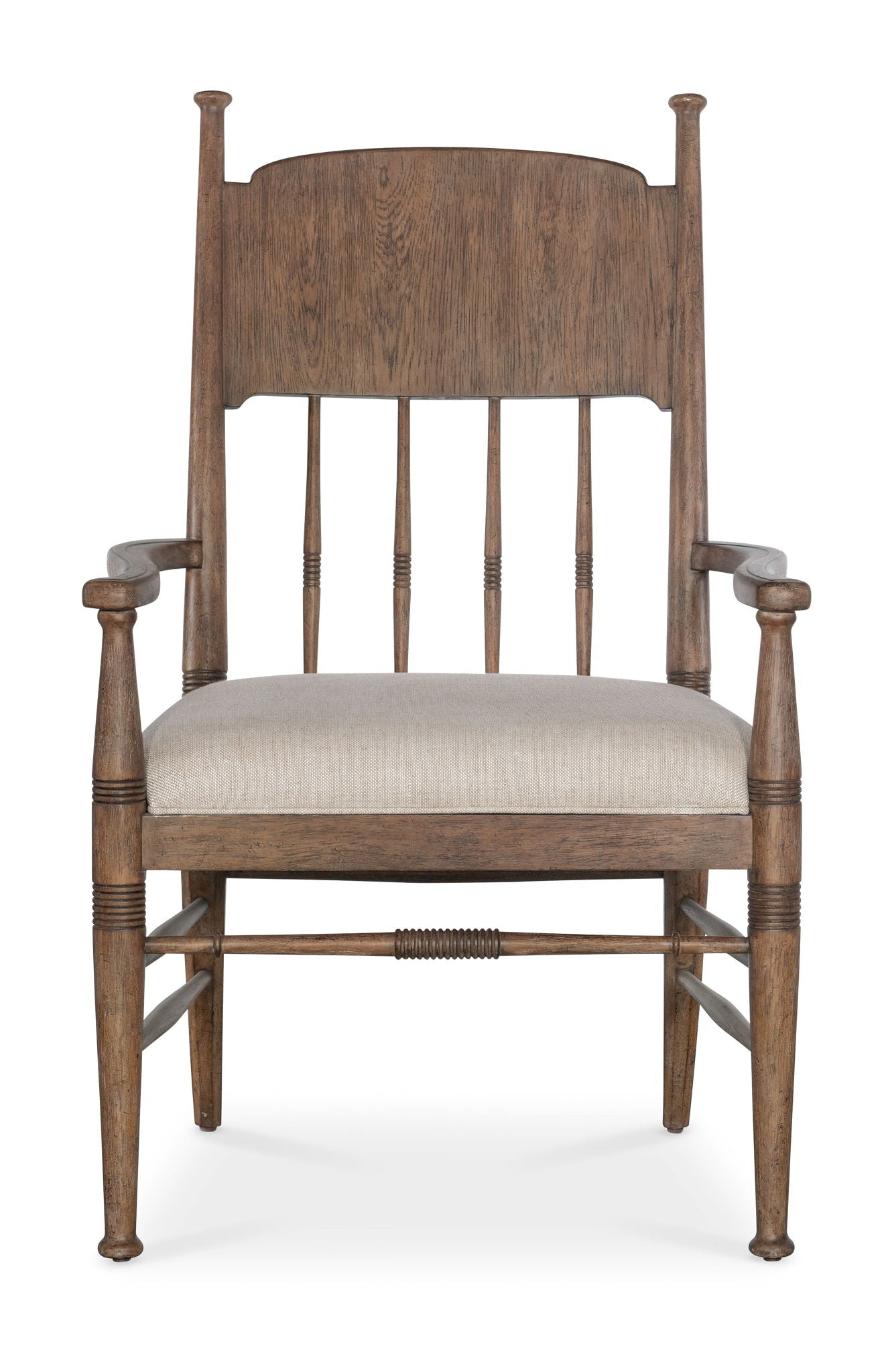 Celebrating the natural beauty of a simpler time, the Americana Upholstered Seat Arm Chair has a spindle back with carved accents on the spindles and frame. Crafted of Oak Veneers with a fabric seat trimmed in welt, it is finished in the time worn finish, with the look of natural wear one might expect of pieces passed down through the family over time, revealing the rich oak character beneath. The seat is upholstered in the 100% Linen performance fabric Biscuit.
