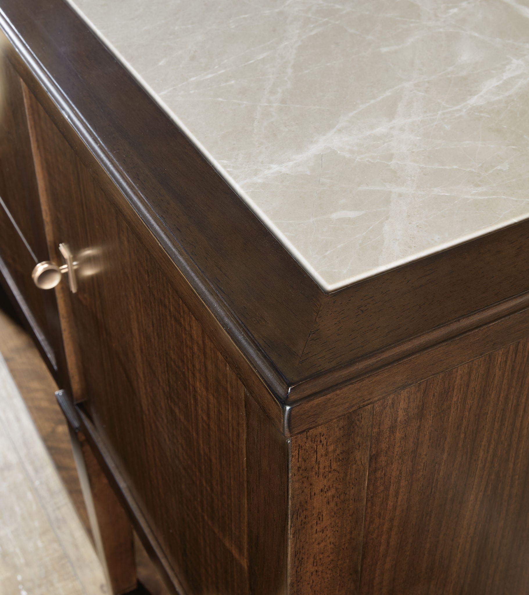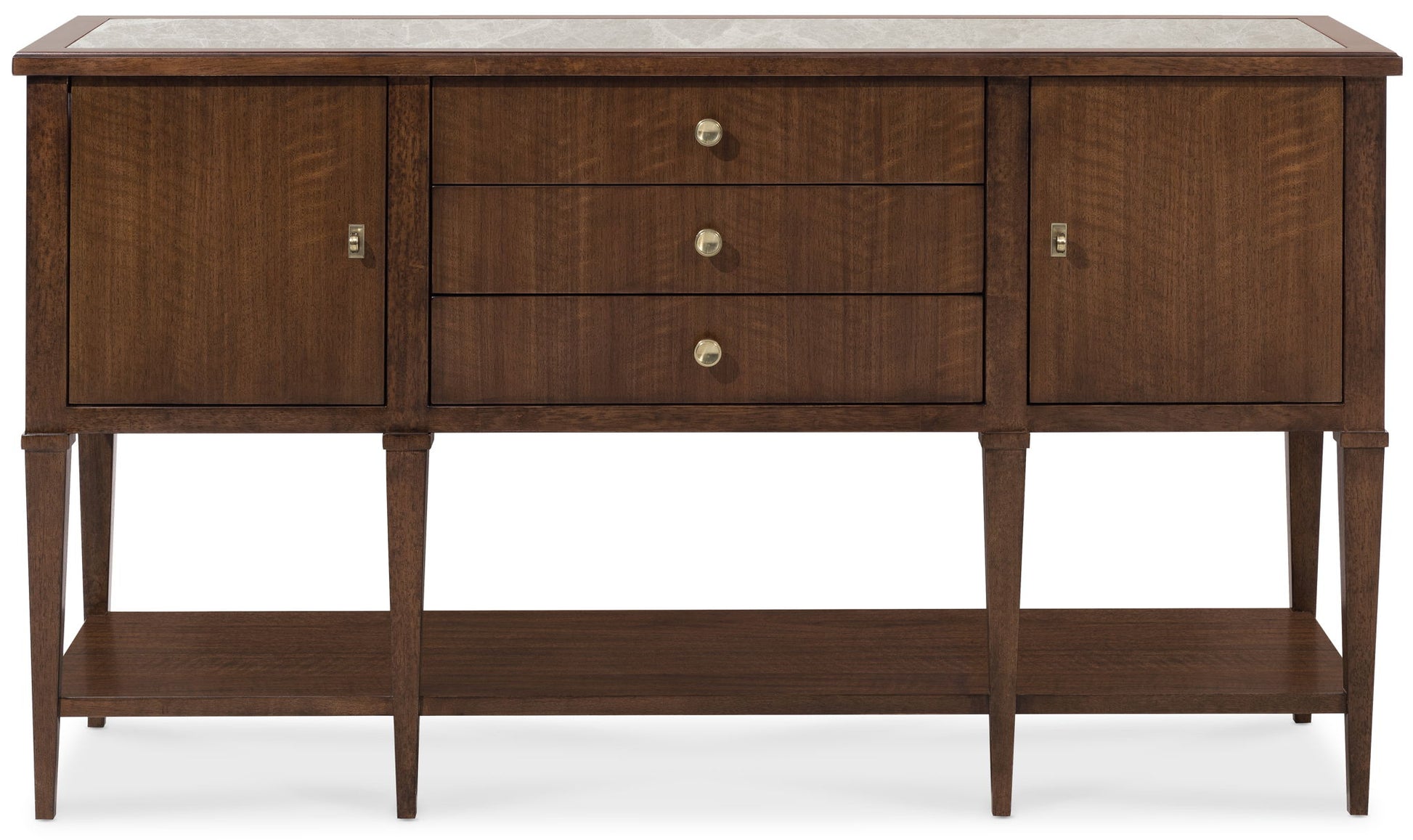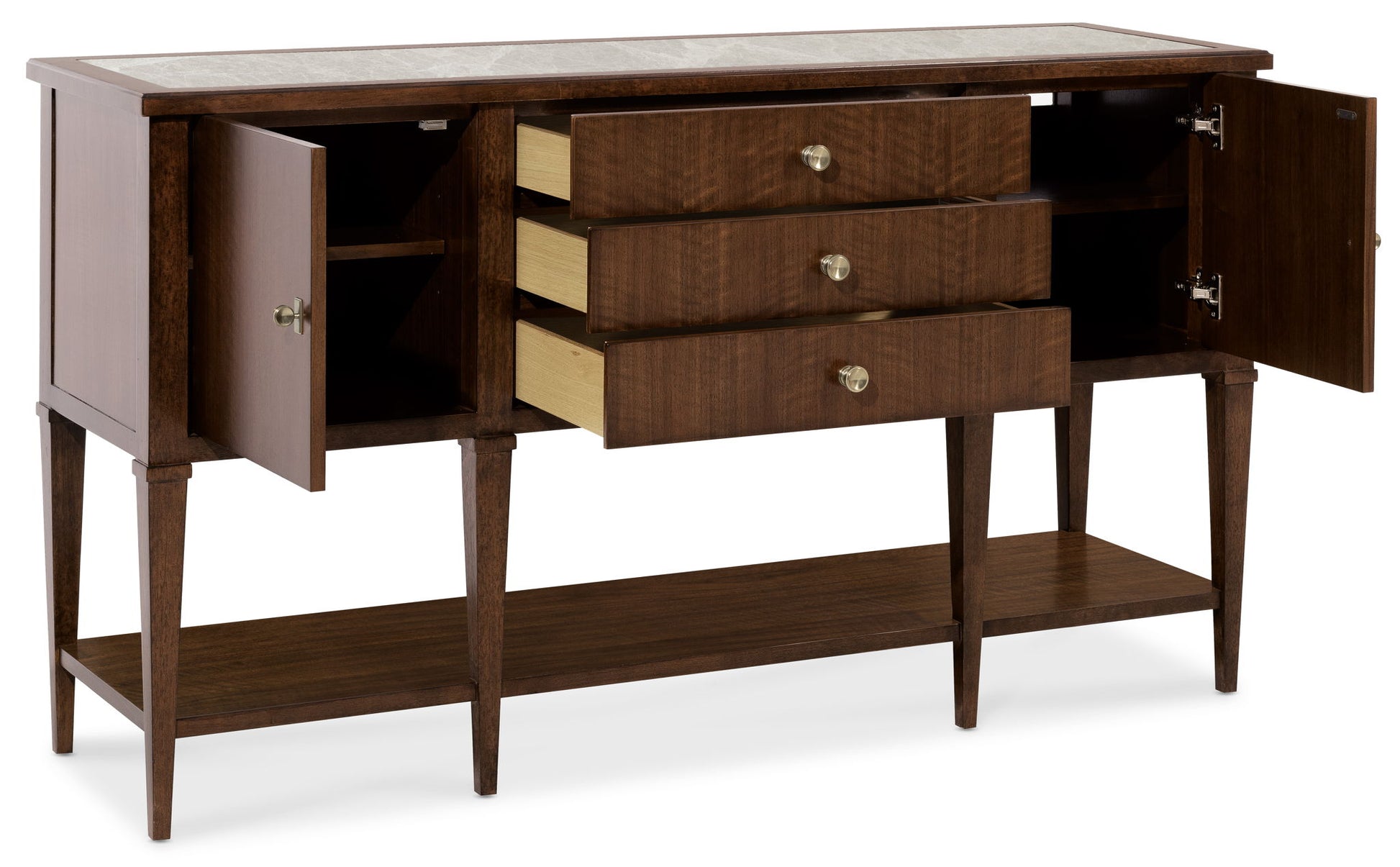 Make a sophisticated statement with the Archives Server, combining refined materials like figured walnut veneers, and a striking Castle Grey marble top. The high clarity Classic Walnut finish enhances the server’s depth and richness, while satin brass hardware adds a luxurious touch. Featuring two doors, three drawers, and an adjustable shelf, this server offers ample storage space, including a silverware tray. Perfect for the dining room, this piece offers both practical function and timeless design, ideal for those who appreciate structured elegance.