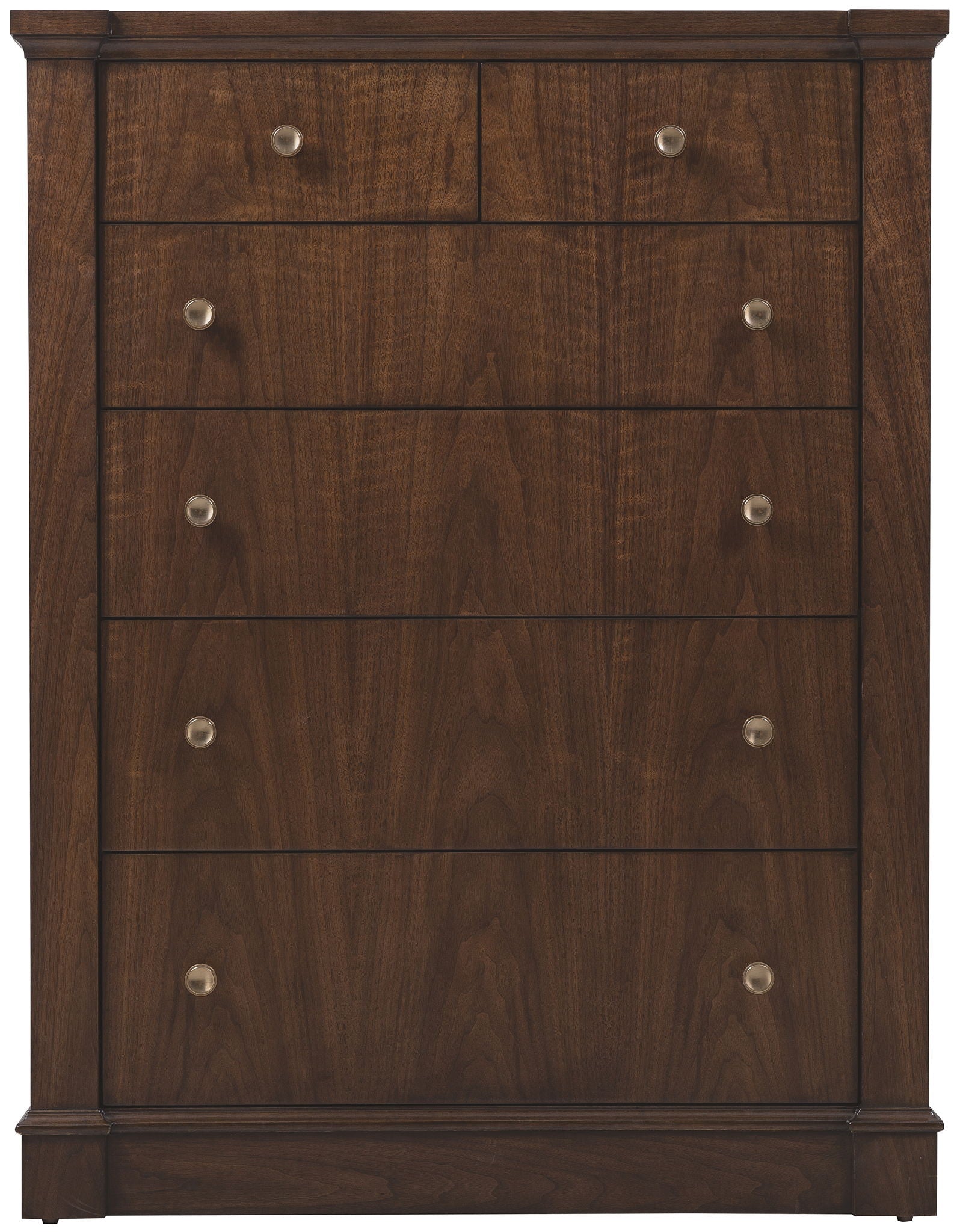 Elevate your bedroom with the timeless elegance of the Archives Six-Drawer Chest. Featuring a high-clarity Classic Walnut finish over figured walnut veneers, this chest boasts unparalleled richness and depth. Its six spacious drawers offer full-height, full-depth, and full-width storage with strong dovetail construction and smooth operation. The cedar-lined bottom drawer provides added protection for your belongings. Custom satin brass knob hardware adds a touch of sophistication, while the handcrafted multi-step finish ensures durability and lasting beauty. Perfect for traditional bedroom aesthetics, this piece blends functionality with classic design.