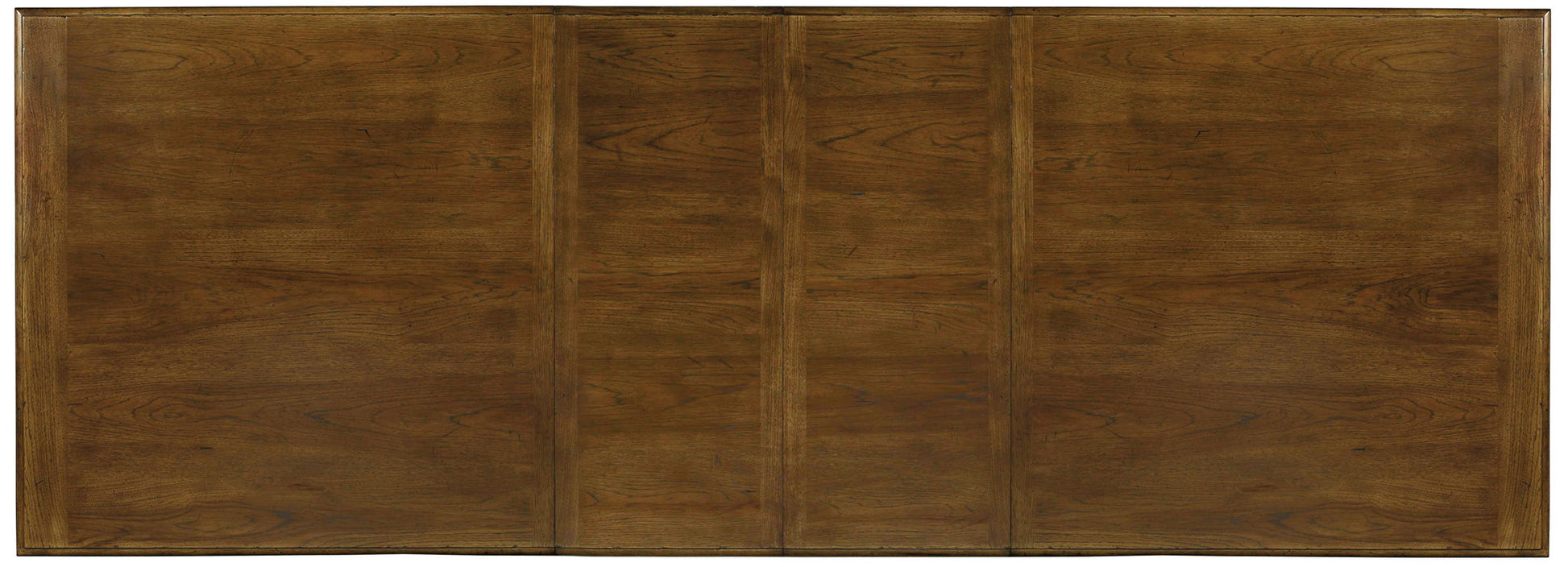 Inspired by French antiques and influenced by classic farmhouse design, the Archivist Trestle Table is an inviting gathering table for welcoming family and friends alike. The classic pedestal bases and top are finished in a soft casual brown over Pecky Pecan, for a rustic authentic look. With two 18-inch leaves, the table extends to 122 inches long to accommodate two arm chairs and six side chairs for large gatherings. Without the leaves, the table will accommodate two arm chairs and four side chairs.