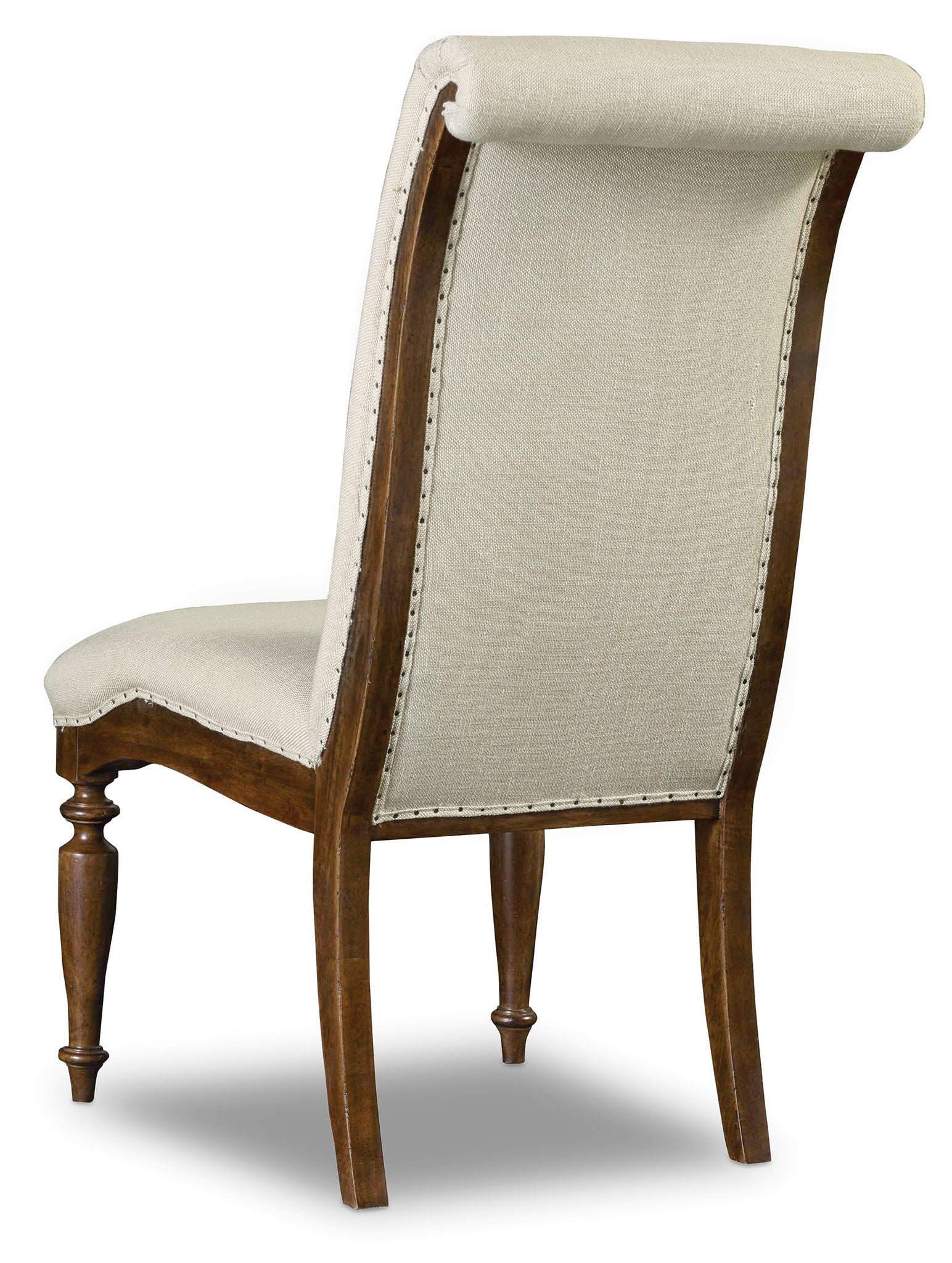 With a world-traveled pedigree, designer details and exquisite comfort come together in the Archivist Side Chair to create a versatile chair of inviting elegance. From the roll-top back to the carved legs to the upholstered tack trim around the seat and back, the Archivist Side Chair will welcome guests to linger around the table or in the family room as an extra seating option. The soft pecan-colored finish over rustic veneers contrasts beautifully with the neutral colored Aubergine Linen fabric on the seat and back for a character-filled and authentic look.