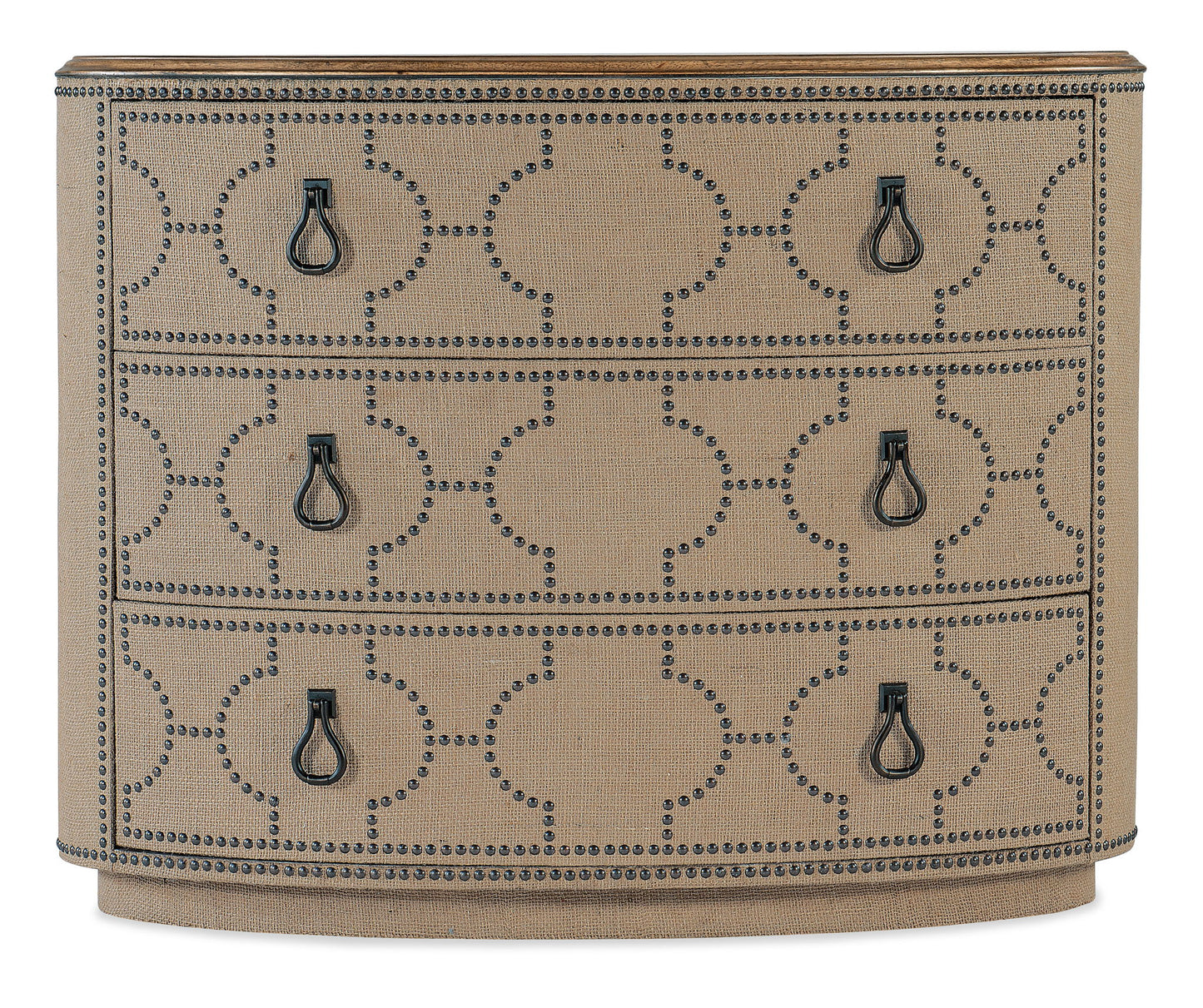 Vintage and tactile with a chic flair, the Big Sky Three-Drawer Chest combines a Pecky Hickory Veneer solid-wood-edged top in a Vintage Natural finish revealing the authentic knots and wood grain with a burlap-wrapped case accented by a patterned nailhead design. With three self-closing drawers, the top drawer has a removable felt liner and the bottom drawer is cedar-lined.