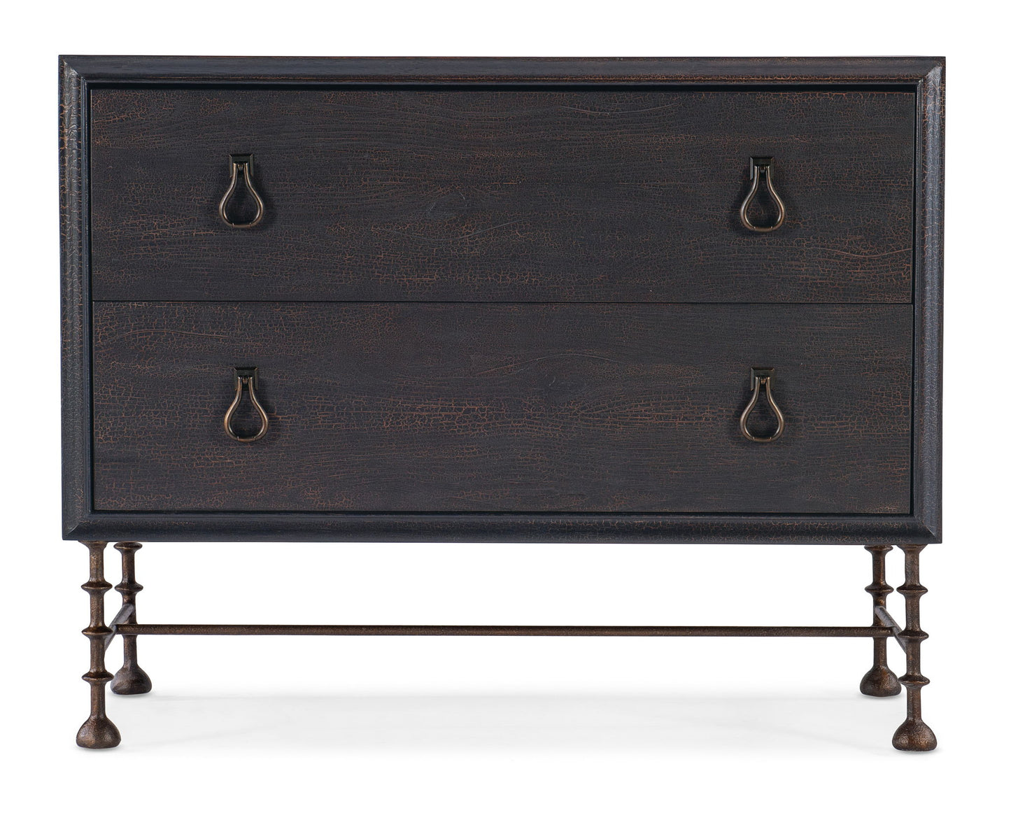 Warm and rustic, the Big Sky Bachelor’s Chest has a vintage design pairing a case crafted of rustic Pecky Hickory Veneers in the dark Charred Timber finish with turned metal legs and stretchers. Featuring two drawers, the top drawer has a removable felt liner and the bottom drawer is cedar-lined. There’s an FC707 power bar with 3 electrical outlets and one live USB port and a cord clip on the back.