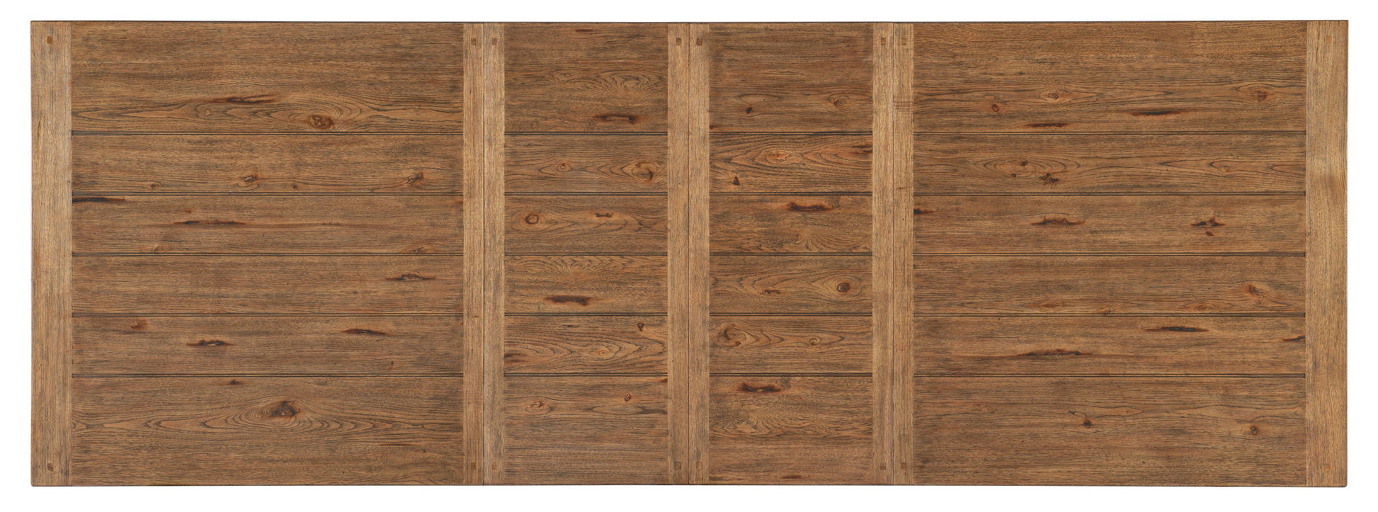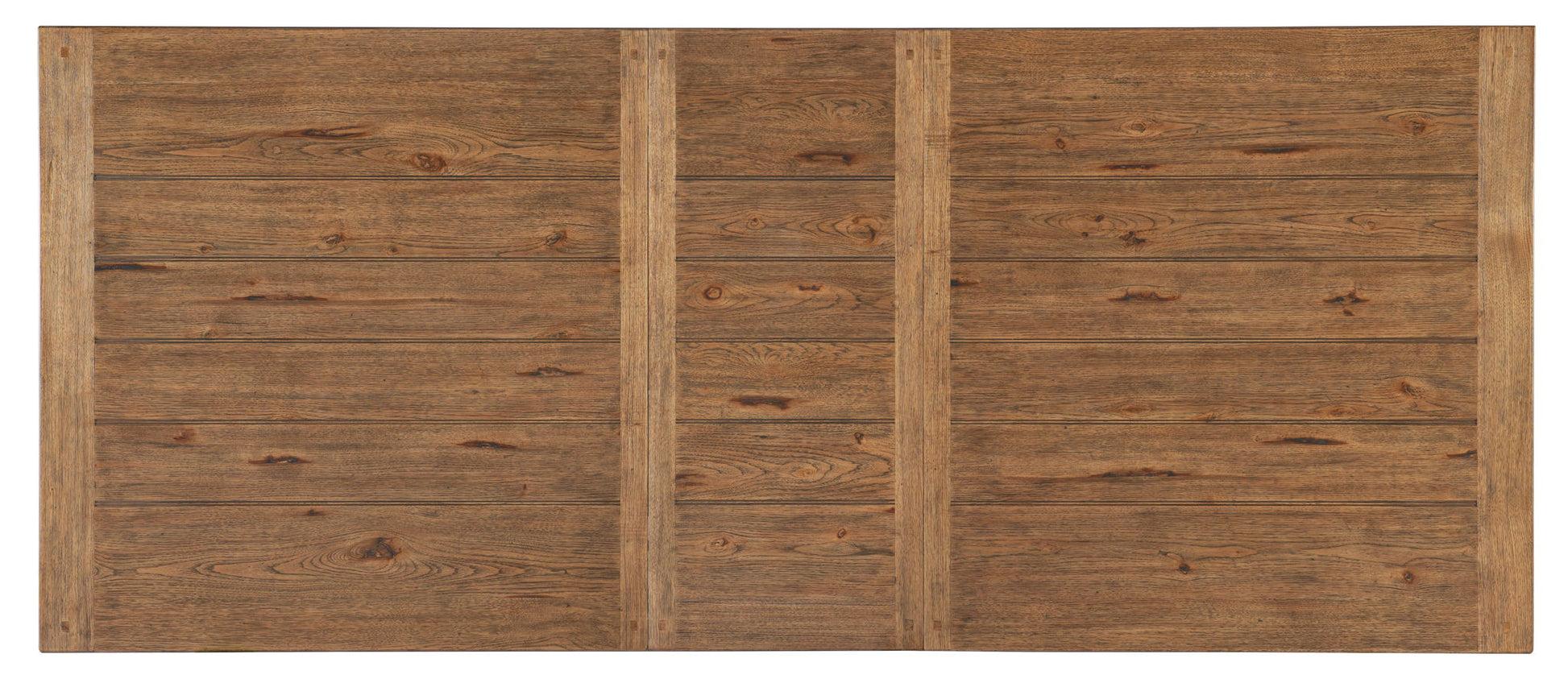 Create a dining experience as large as the landscapes in America’s wilderness with the Big Sky Trestle Dining Table. Crafted of Pecky Hickory Veneers with an authentic solid-wood edged top, the tabletop is finished in the warm Vintage Natural finish, contrasting with an X-style base in the Charred Timber finish. The table has two 20-inch leaves, extending to 132 inches long with both leaves in place. Without the leaf, the table accommodates 2 coordinating arm chairs and 4 side chairs; with one leaf, it accommodates 8 chairs and with both leaves, it accommodates 10 chairs.