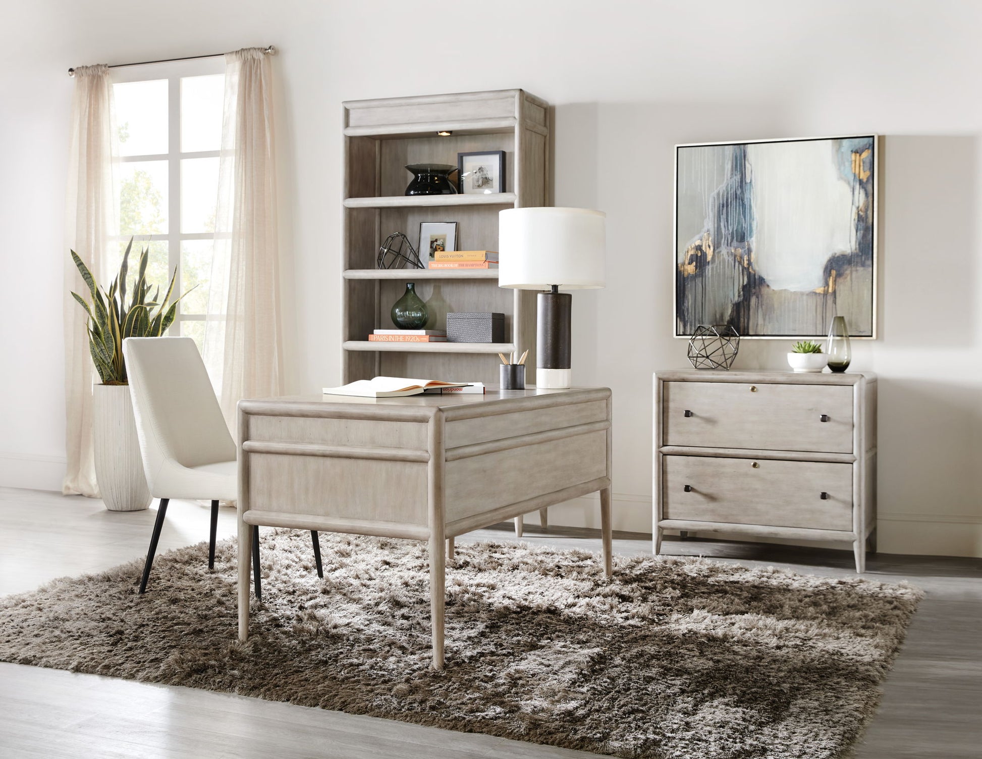 With a soft modern and casual appeal, the Burnham Bookcase is crafted of Alder Veneers with knots in a Grey Mink finish accentuated by a tactile veneer pattern on the back panel and slender tapered legs. Featuring four fixed wood-framed glass shelves, the bookcase has a puck light in the top with a 3-intensity touch switch on the right pilaster.