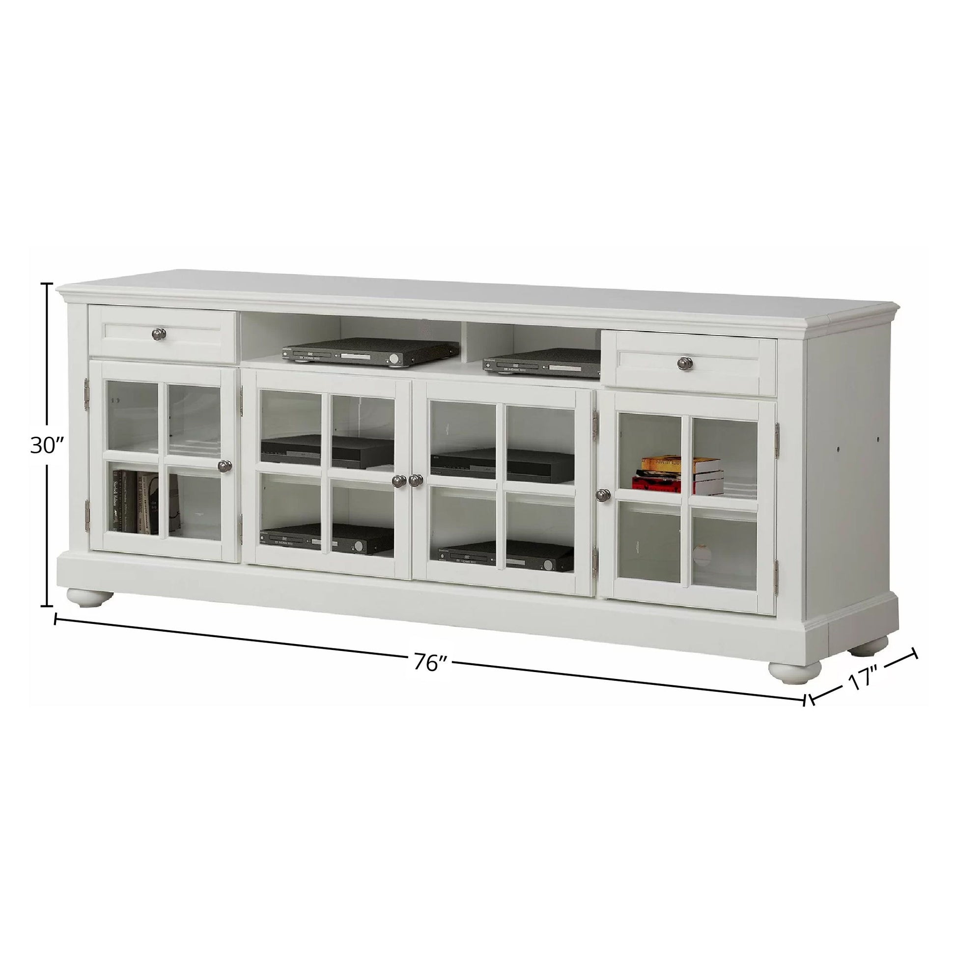 Display your television and media components in fashionable style with this 63-inch TV Console from the Cape Cod collection. Crafted in a fresh Vintage finish, its easy going character is sure to enhance the look of any room. Glass doors, generous storage, display shelves and a multi-step finish are just a few of its many fabulous features.