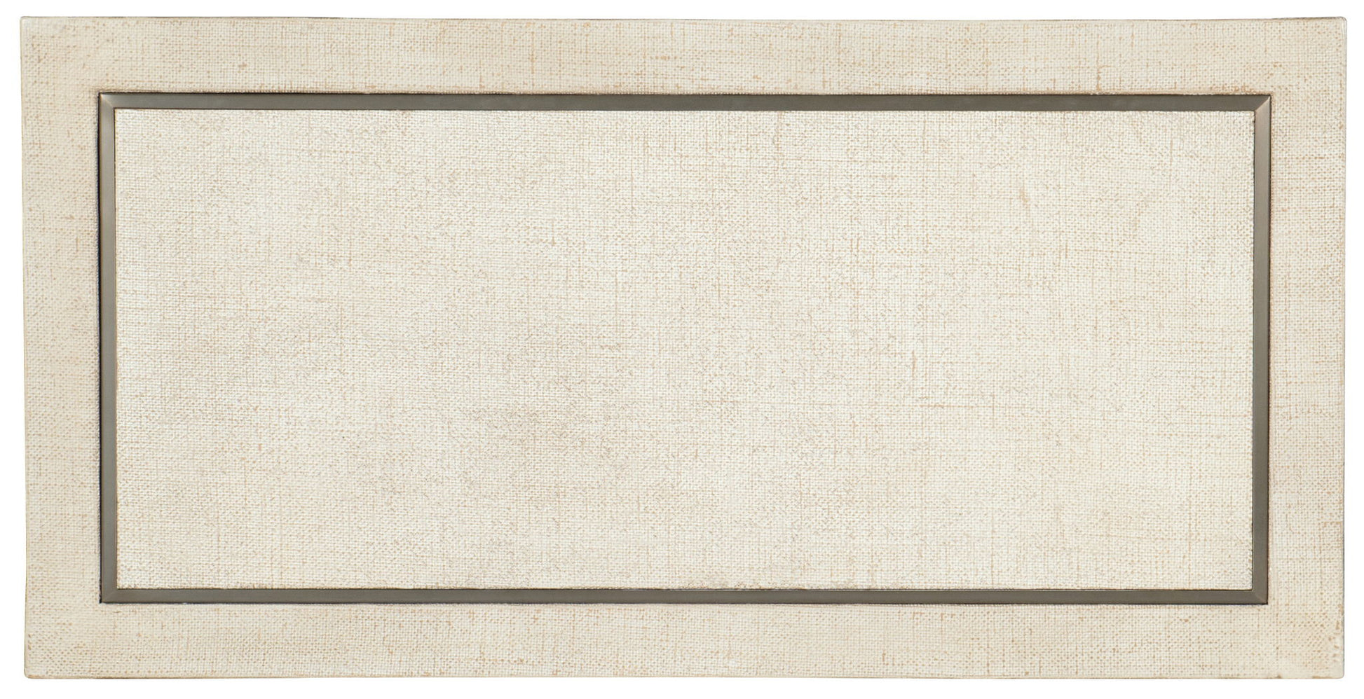 A sleek profile combines with a serene color palette in the Cascade Nightstand, offered in a lacquered burlap finish called Pebble Beach with a champagne-colored metal inlay around the top for a touch of sparkle. This airy piece offers the function of a middle and bottom shelf, one self-closing drawer and a cord clip on the back. Finished on all sides.
