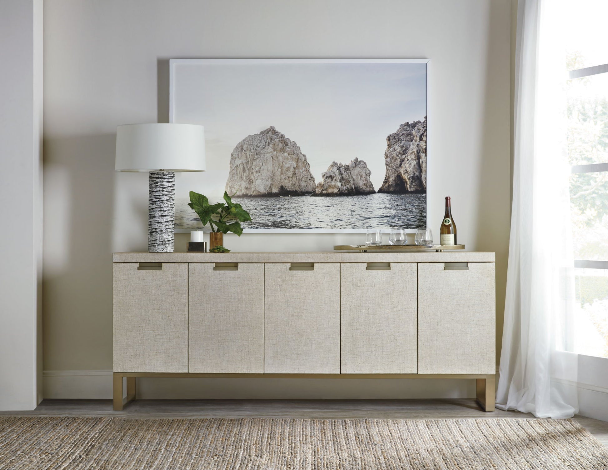 Create a calm and tranquil atmosphere of hospitality with the sleek and sophisticated silhouette of the Cascade Server. Featuring a soothing color palette of whites, cream, taupe and champagne, the 5-door cascade server is brimming with storage. Finished in Pebble Beach, a lacquered burlap finish, the server is accented by a champagne-colored metal base and recessed pulls. There’s one adjustable shelf behind the left and right pair of doors and one adjustable shelf behind the center door.