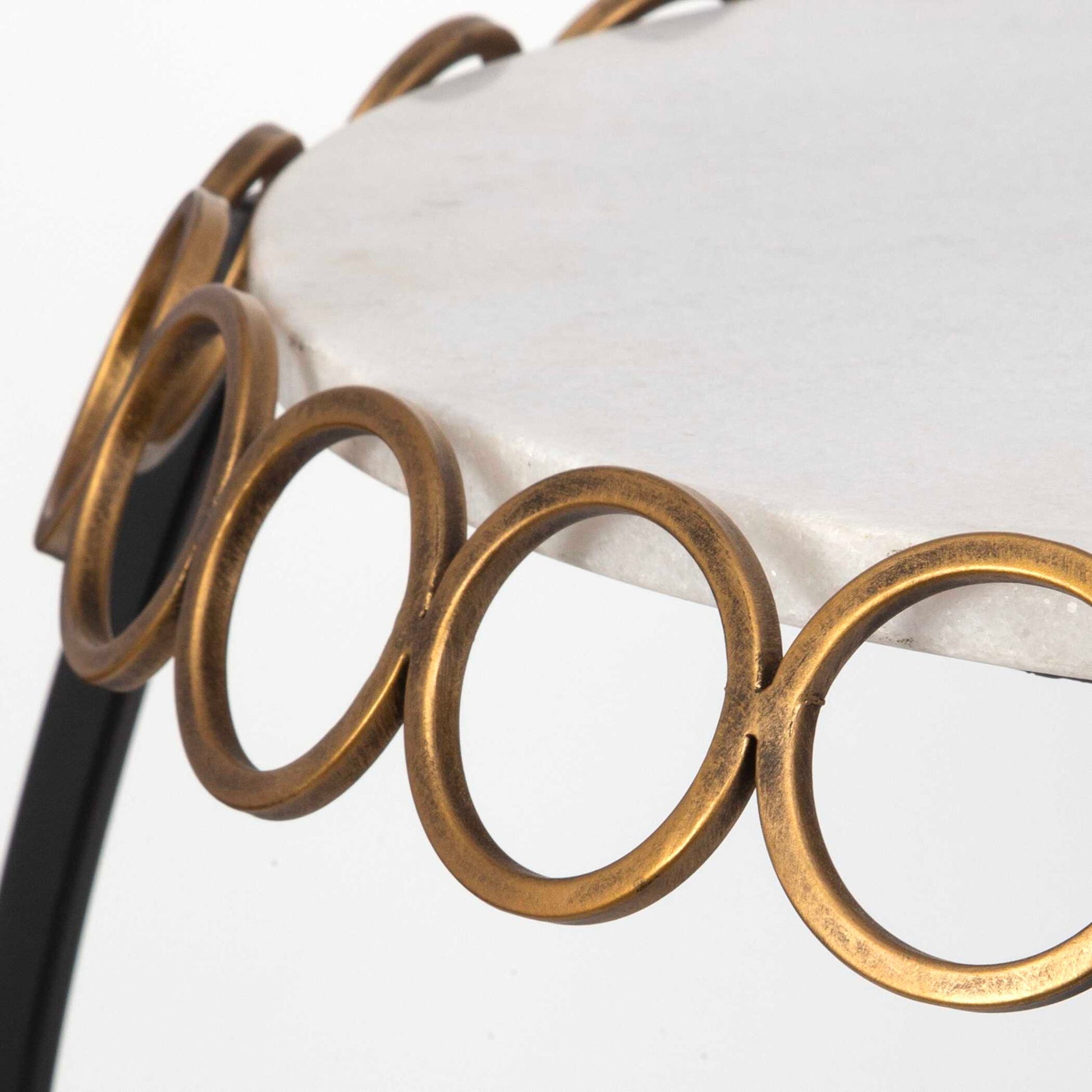 Shelves Of Honed White Marble Are Decorated With Antique Gold Ringlets With Gracefully Arched Iron Legs In Matte Black. True To The Nature Of Natural Materials, Each Piece Will Have Unique Marbling And Veining Throughout.