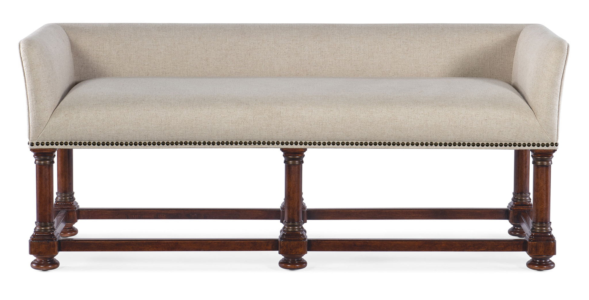 Grand, plush and inviting, the Charleston Bed Bench contrasts a vibrant Black Cherry finish with the Chateau Linen performance fabric on the seats, sides and back, accented by nailhead trim. The six turned legs are joined by wood stretchers all the way around the bench.