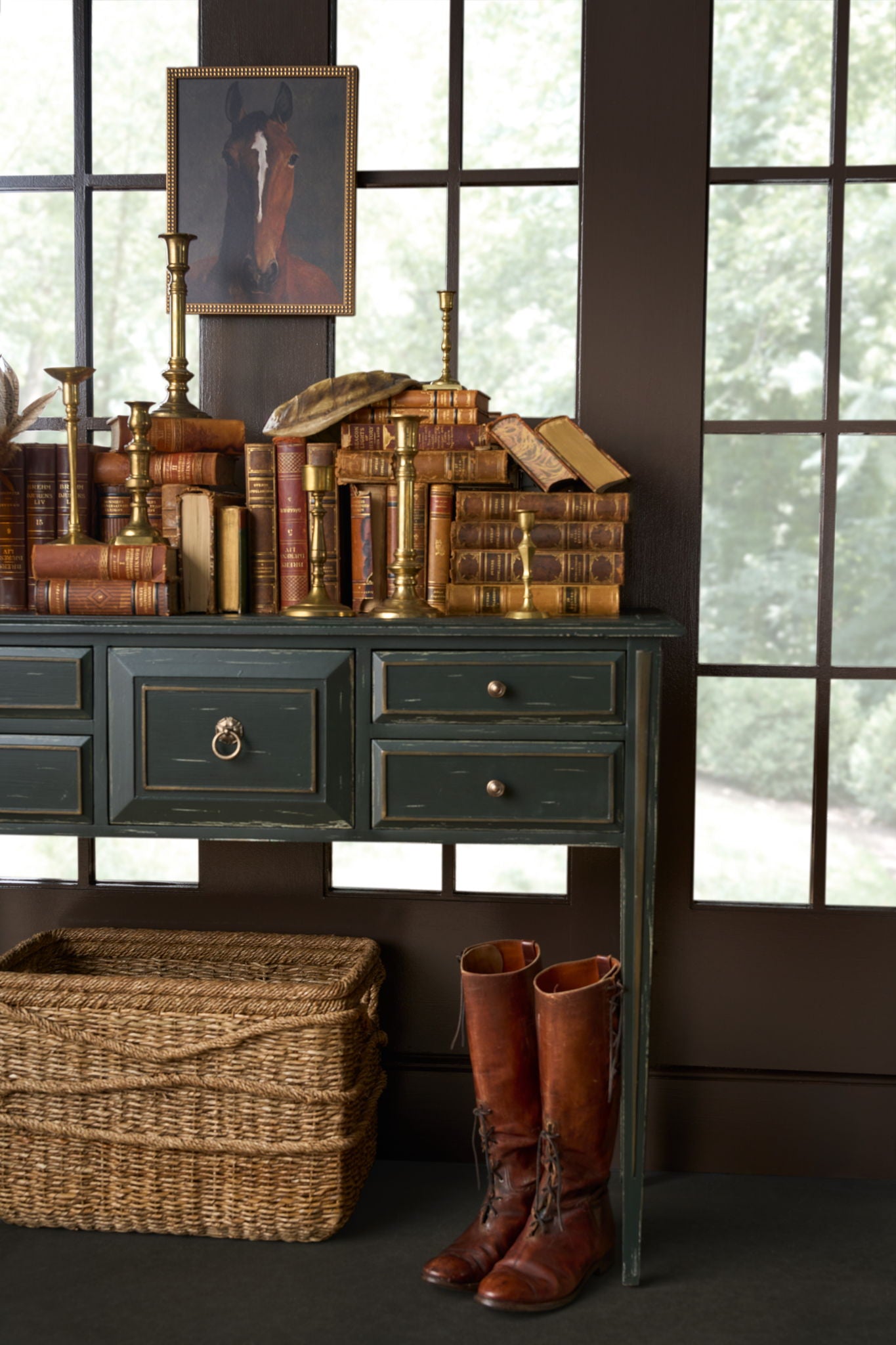 The vintage charm of the coastal South meets the traditional soul of the Federal and Georgian design period with the Charleston Five-Drawer Console Table. Featuring tapered legs and accent highlights, the five self-closing drawers on the chest are finished in a cherry color on the interior. Crafted of Maple Veneers, the table is finished in Charleston Green, a weathered interpretation of the classic dark, almost black, green that adorns trim, shutters and doors across all the historic district of Charleston. The knob and ring pulls are in an antique pewter color.