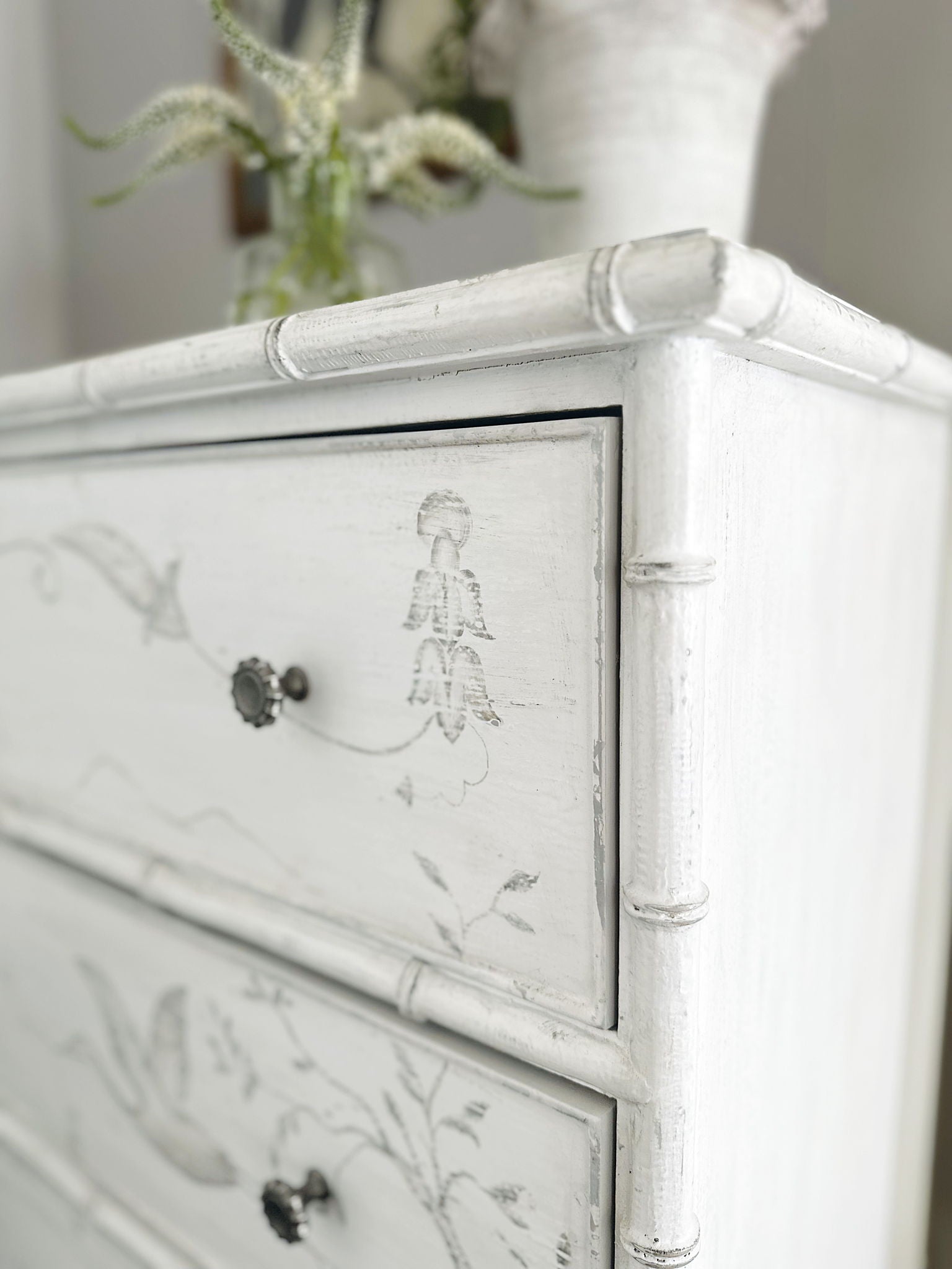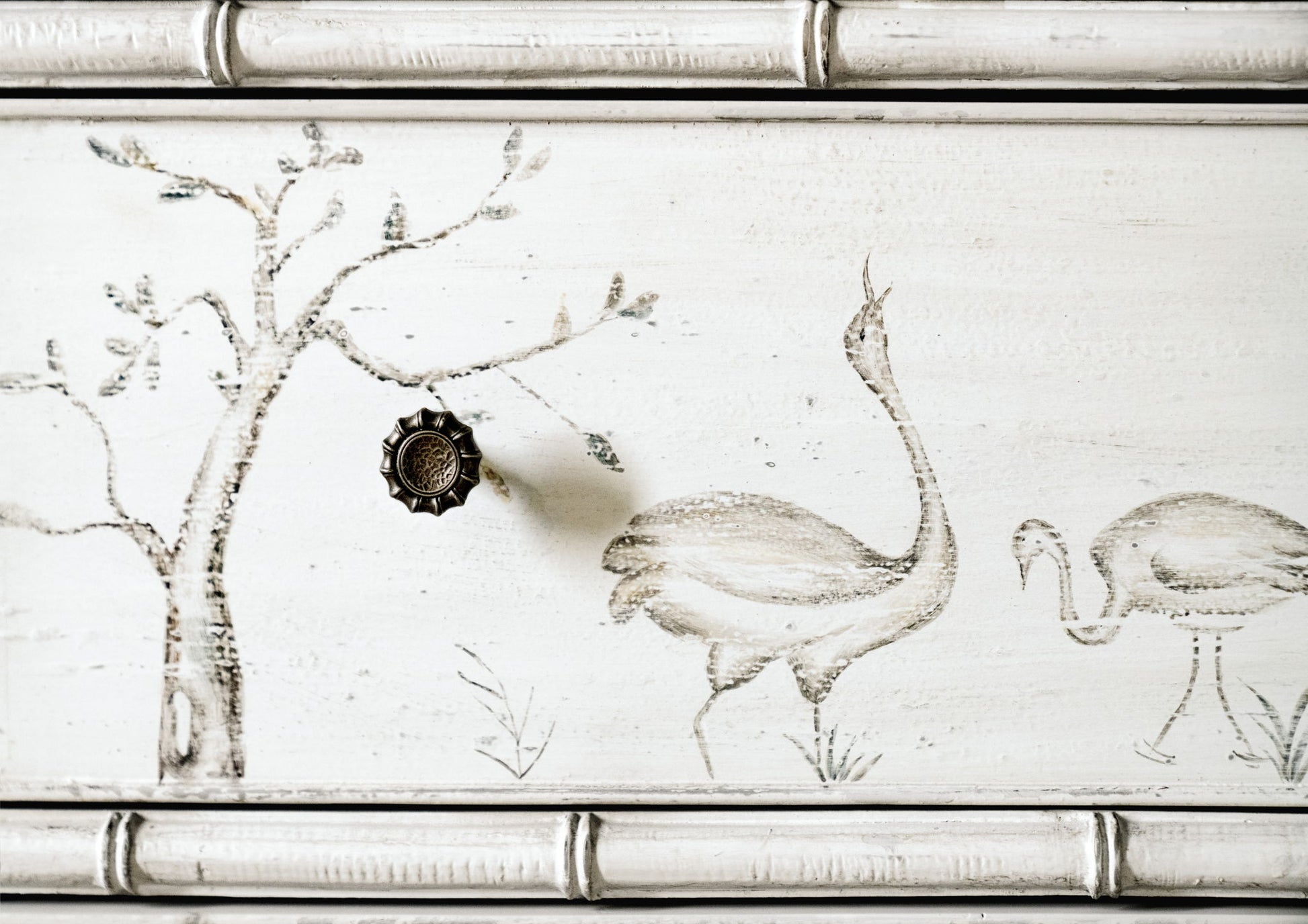 Inspired by the tropical craftsmanship of the West Indies and the cane accents of the classic British and Dutch Colonial design periods, the Charleston Three-Drawer Accent chest has bamboo-motif trim and lovely handpainting on the drawer fronts with a Heron and botanical design. The interiors on the 3 self-closing drawers are the same color as the exterior. Crafted in Maple Veneers, the chest is finished in Haint Blue, a soft color which can be found on the ceilings of porches and entryways, window shutters and doors in the American South, dating back more than 200 years from the Gullah folklore that held the color kept “haints” or spirits from entering homes and dwellings. The round knobs are antique bronze-colored.