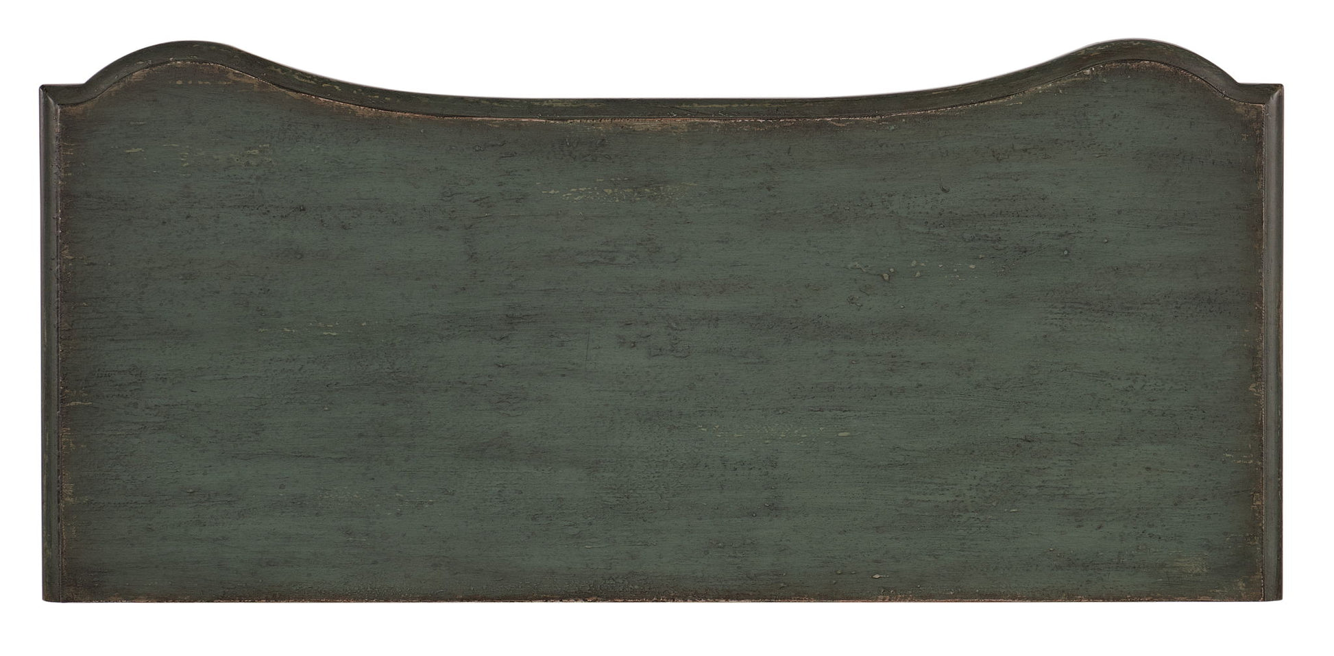 Capturing the vintage charm of the coastal South and the tropical craftsmanship of the West Indies, the Charleston Three-Drawer Accent Chest has scalloped legs and dramatic decorative pulls in a carved leaf motif in an antique bronze color. Crafted of Maple Veneers, the chest is finished in Gullah Green, a deep teal-blue reminiscent of the mysterious waters within wetlands and marshes of the American South. The 3 self-closing drawers have an interior color matching the exterior.