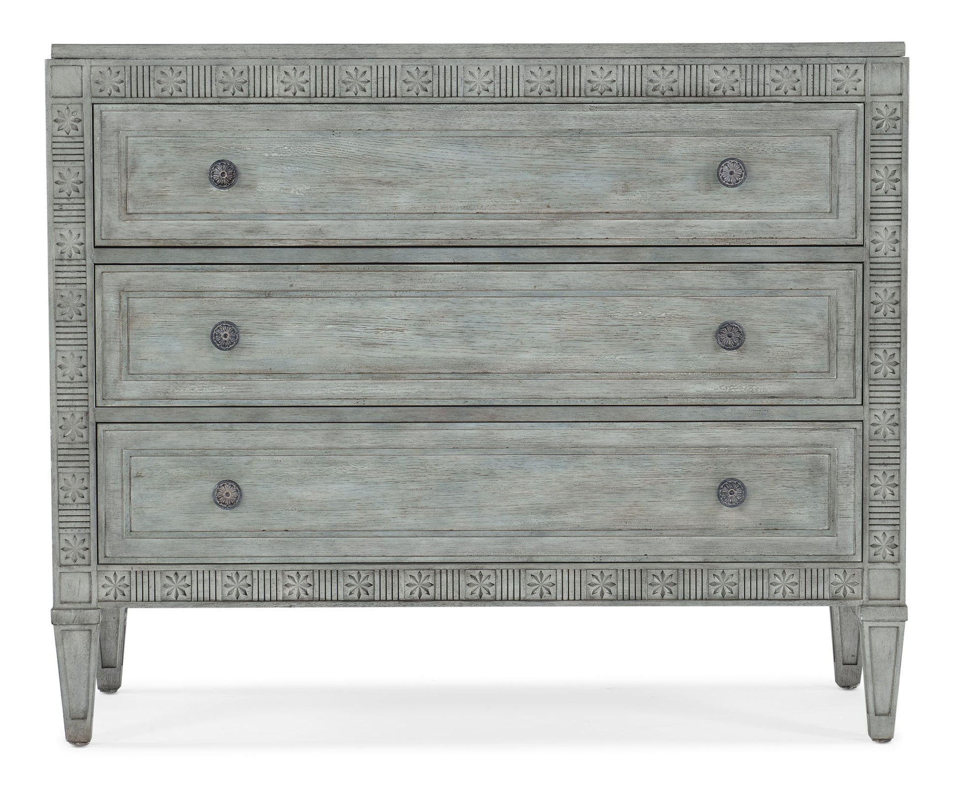 Capturing the vintage charm of the coastal South, the Charleston Three-Drawer Accent Chest has carved floral fretwork accents and tapered legs. Crafted of Maple Veneers with a Solid-Wood Edge top, it is finished in Waterscape Blue, a transparent blue-green coloration allowing you to see the natural grain of the wood. The 3 self-closing drawers have an interior to match the exterior. The antique pewter round knobs have decorative white hangup accents.