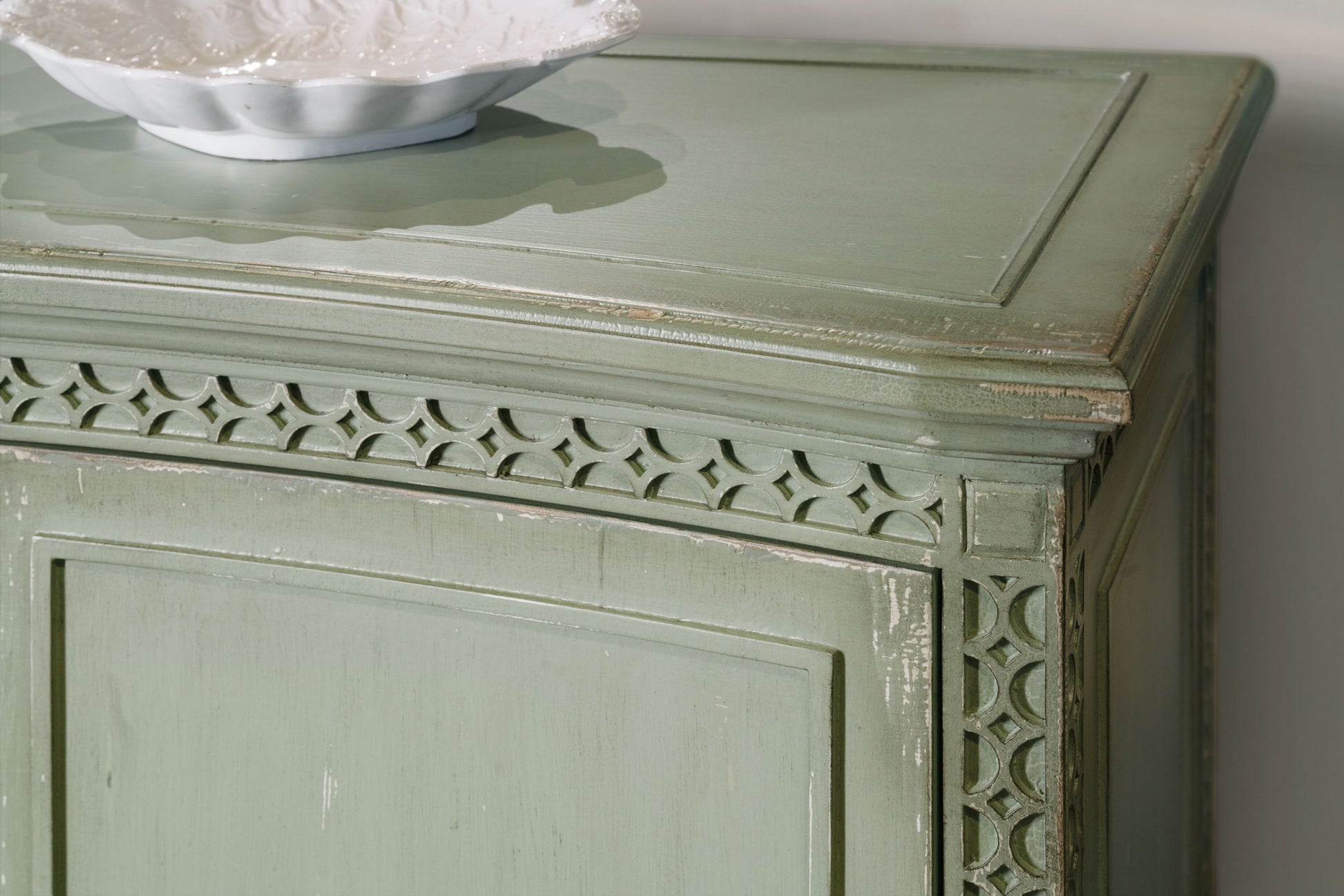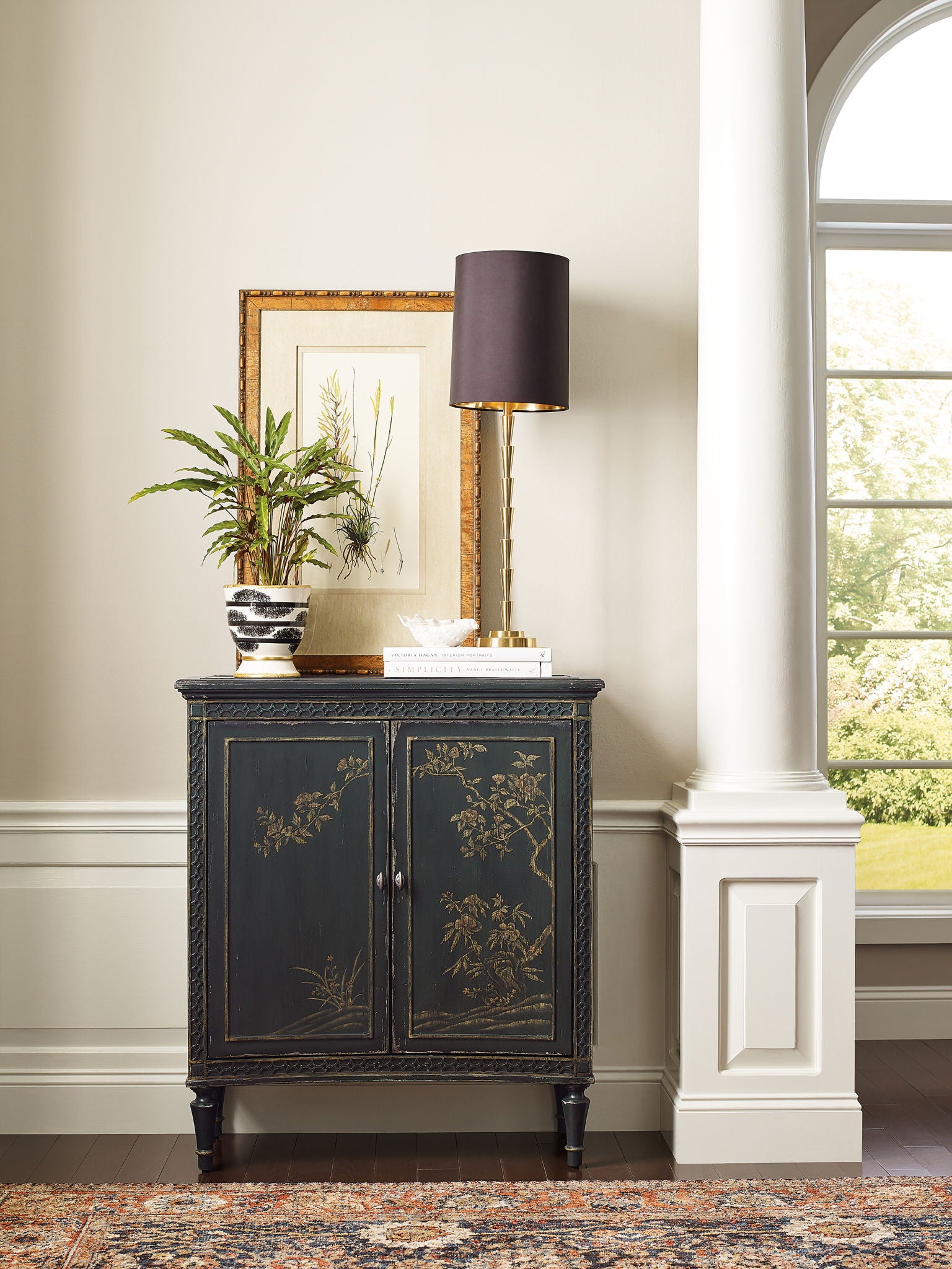 Capturing the vintage charm of the coastal South, the Charleston Two-Door Accent Chest has two doors with soft-close hinges, decorative fretwork accents along the edges, and regionally-inspired handpainting and highlighting on the door fronts. Crafted of Maple Veneers, the cabinet is finished in a weathered interpretation that adorns the trim, shutters and doors across the historic district of Charleston. Loop pull hardware is in an antique pewter color. One adjustable shelf behind the doors.