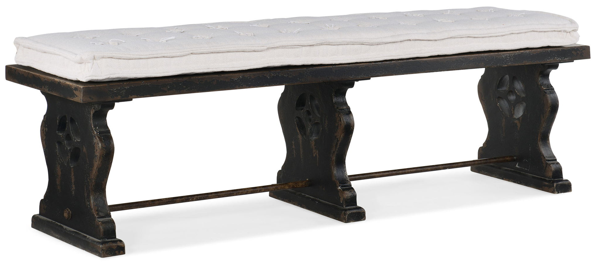 Add vintage elegance and extra seating to your dining table, the foot of your bed, your hallway or family room with this versatile Ciao Bella Bench. The unique harp-shaped legs form a beautiful base, along with a burnished brass stretcher. The exquisite black finish has multi-layered rub-through, giving the appearance it is aged gracefully through the decades. The lay-on cushion in Tuscan White is button tufted on one side with French Primitive tufting on the other side for comfort.
