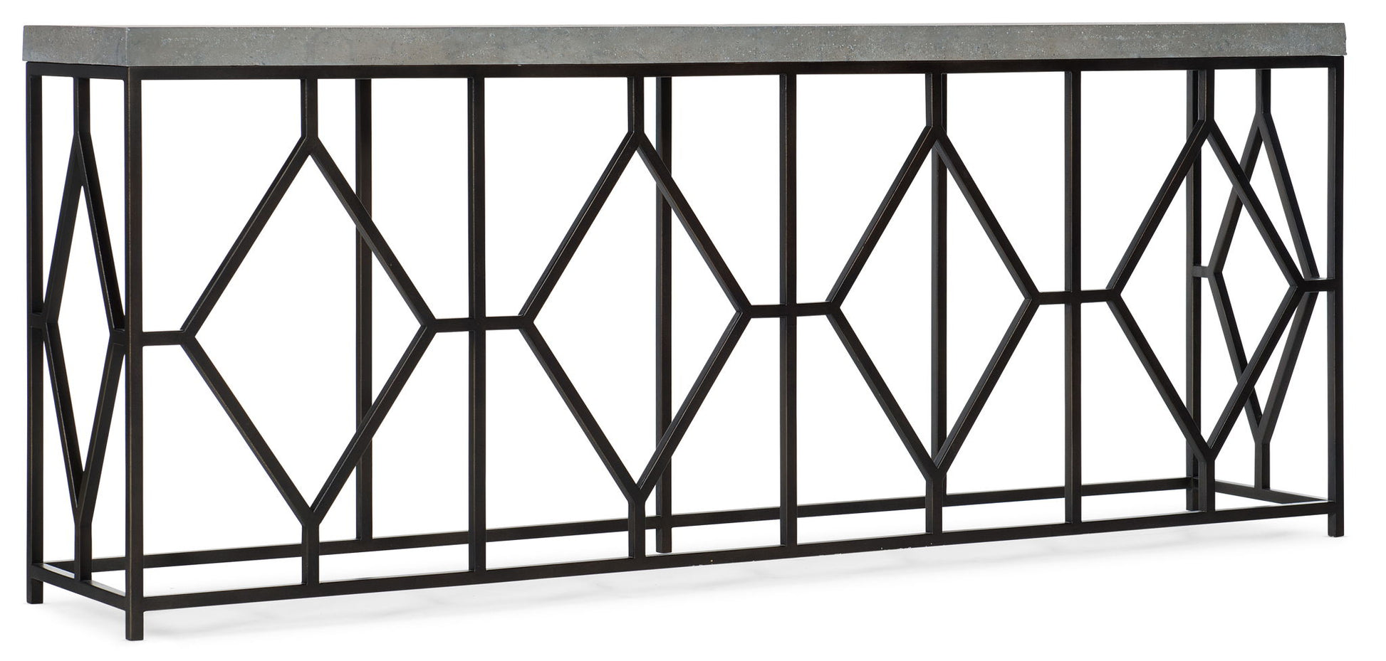 Create a stylish focal point in any room with the intricate metal base with diamond motifs, topped by a chic concrete surface that makes this piece perfect for interiors from the farmhouse to the penthouse. The base is in an Aged Steel finish and the faux concrete top is a soft gray white.