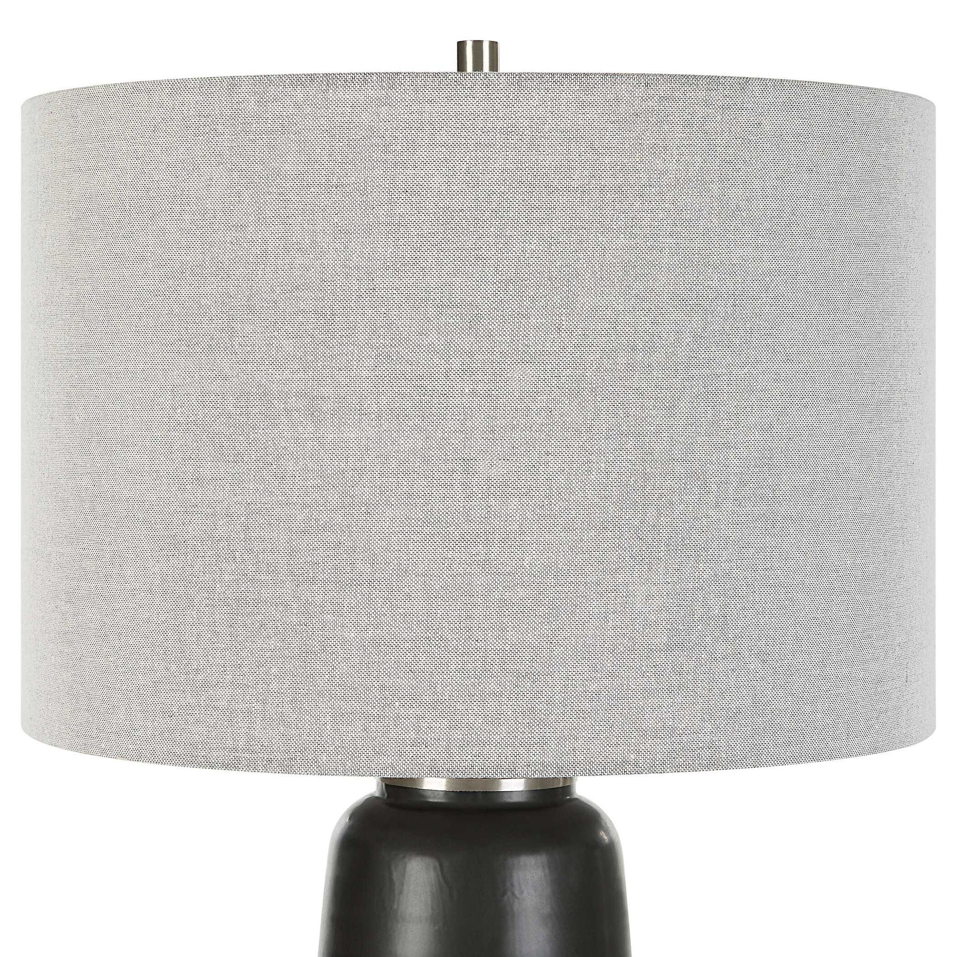 This Ceramic Table Features A Warm Gray And Aged Black Glaze Finish Separated By A Rustic Brown Uneven Band, Accented With Brushed Nickel Details. The Round Drum Shade Is Made With A Casual Light Gray Linen Fabric. Due To The Nature Of Fired Glazes On Ceramic Lamps, Finishes Will Vary Slightly.