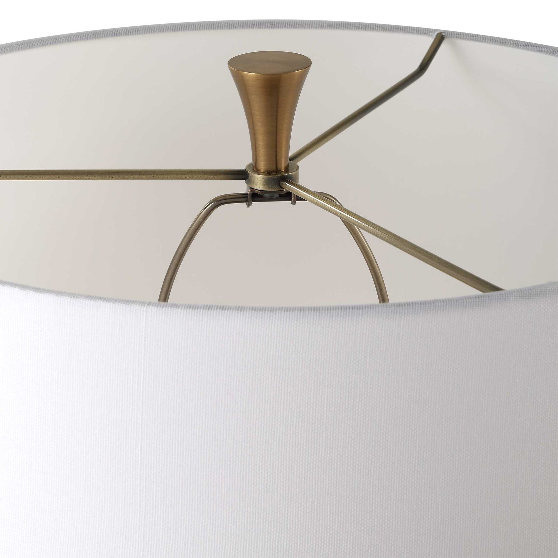 This Lamp Adds An Air Of Elegance And Sophistication To Any Space. The Base Of The Lamp Is Crafted From Man-made Stone That Accurately Replicates The Look Of Thassos Marble And Is Accented By Plated Antique Brass Details, Displayed On A Crystal Foot. The Tapered Round Hardback Shade Is Covered In A Linen Fabric.