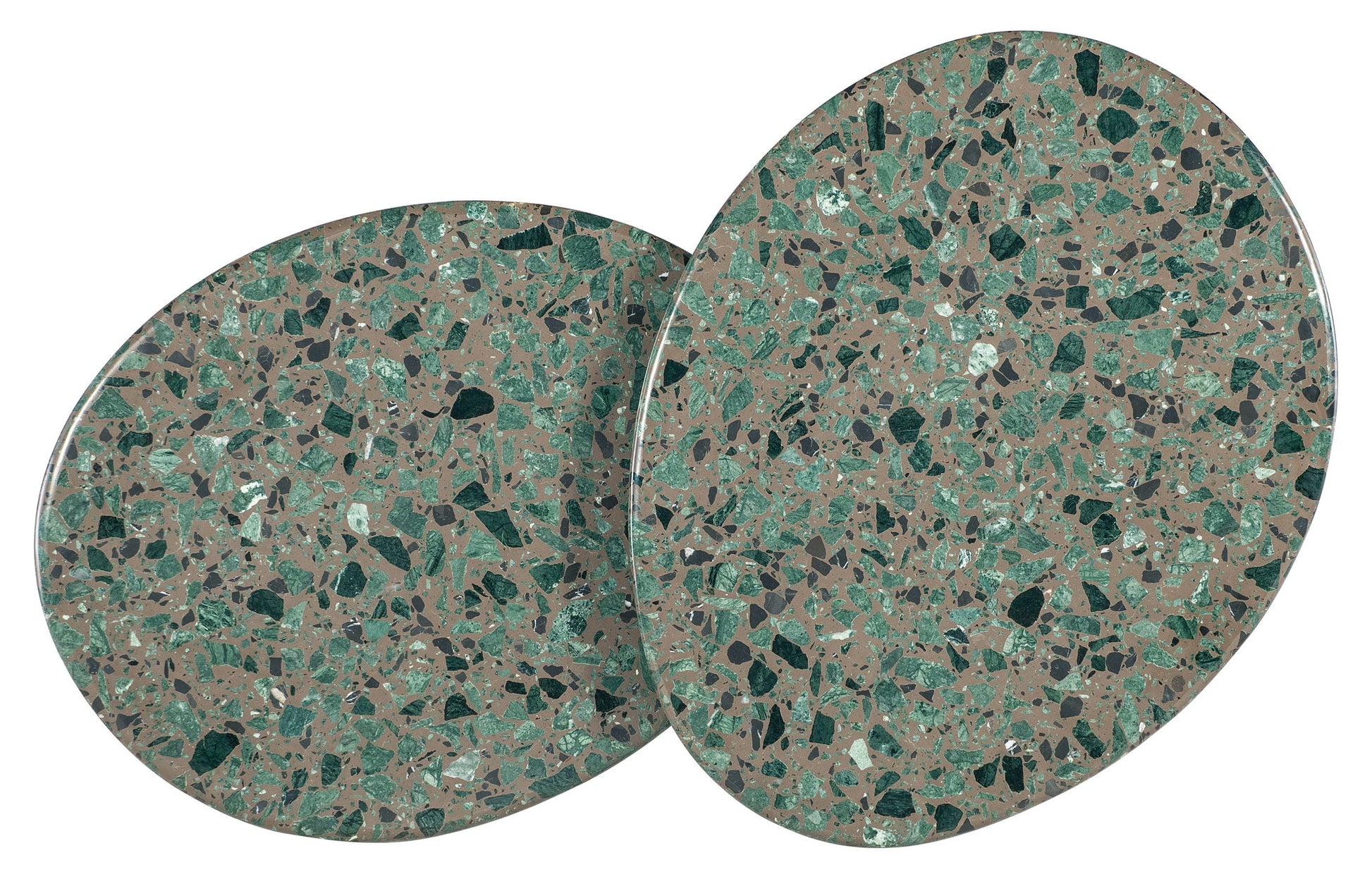 In a dynamic blend of shapes, materials and color, the Antares Cocktail Table is a stone-topped, two-tiered design. The textured metal base is complemented by soap stone tops with flecks of green, black and charcoal. 50 inches wide x 29-inches deep.