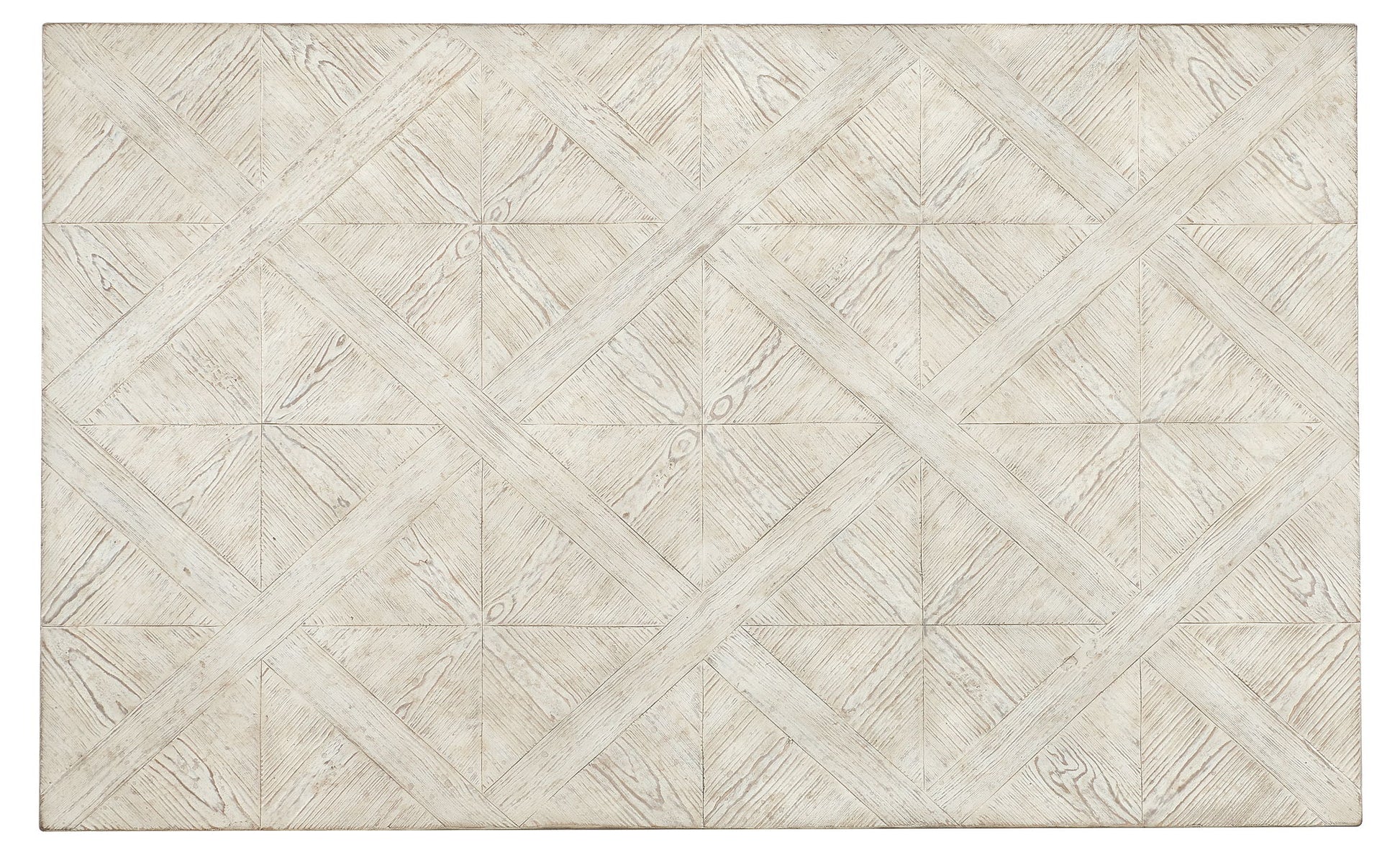 In a 54W x 33D rectangle form, the Block Buster Cocktail Table is crafted of Pine with parquet-patterned veneers in a creamy white finish with rub-through and distressing and a plinth base.