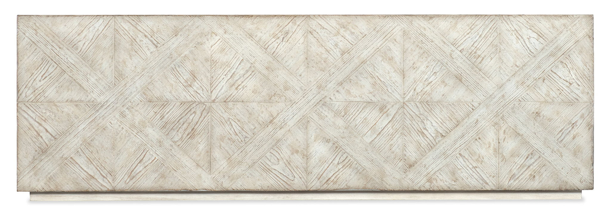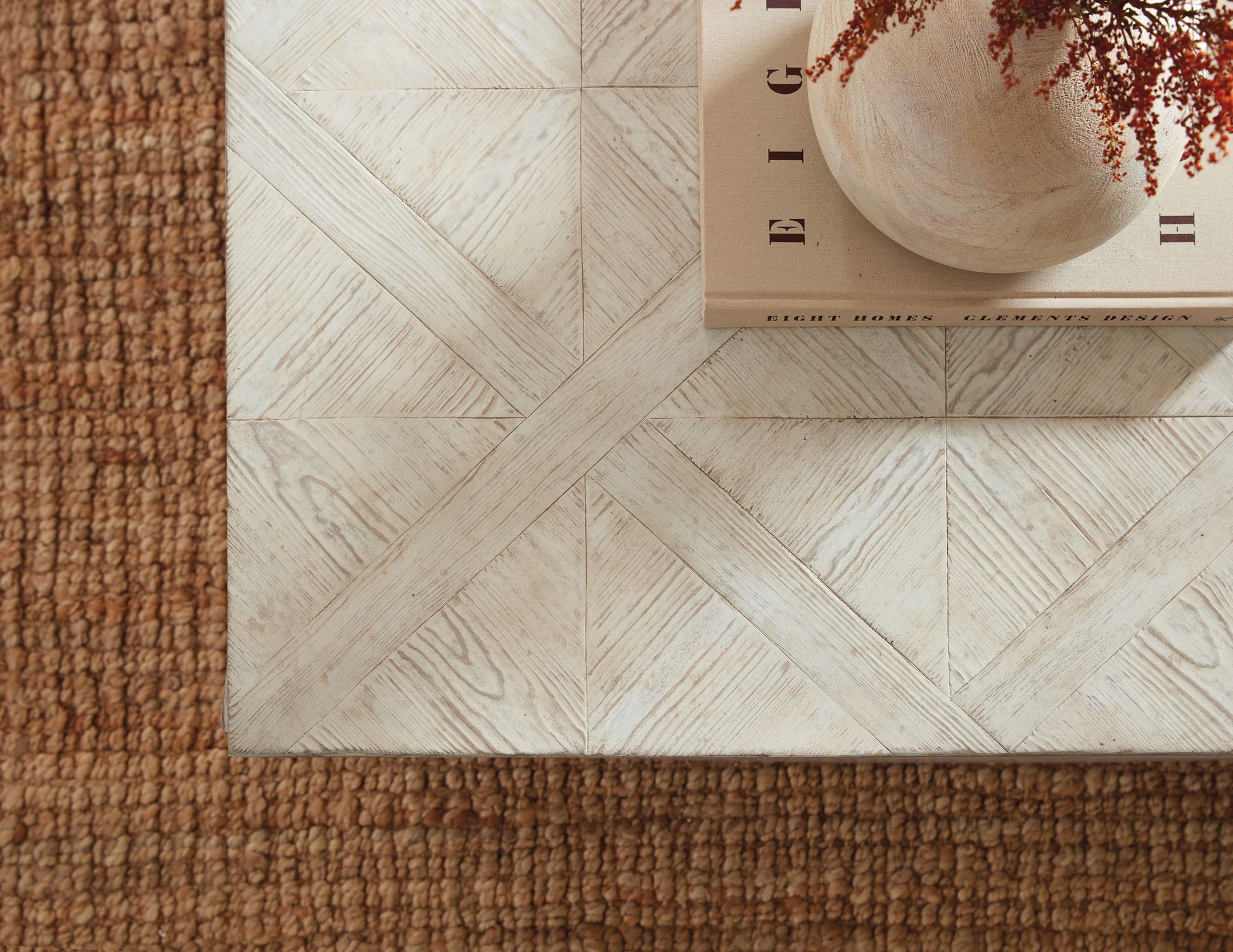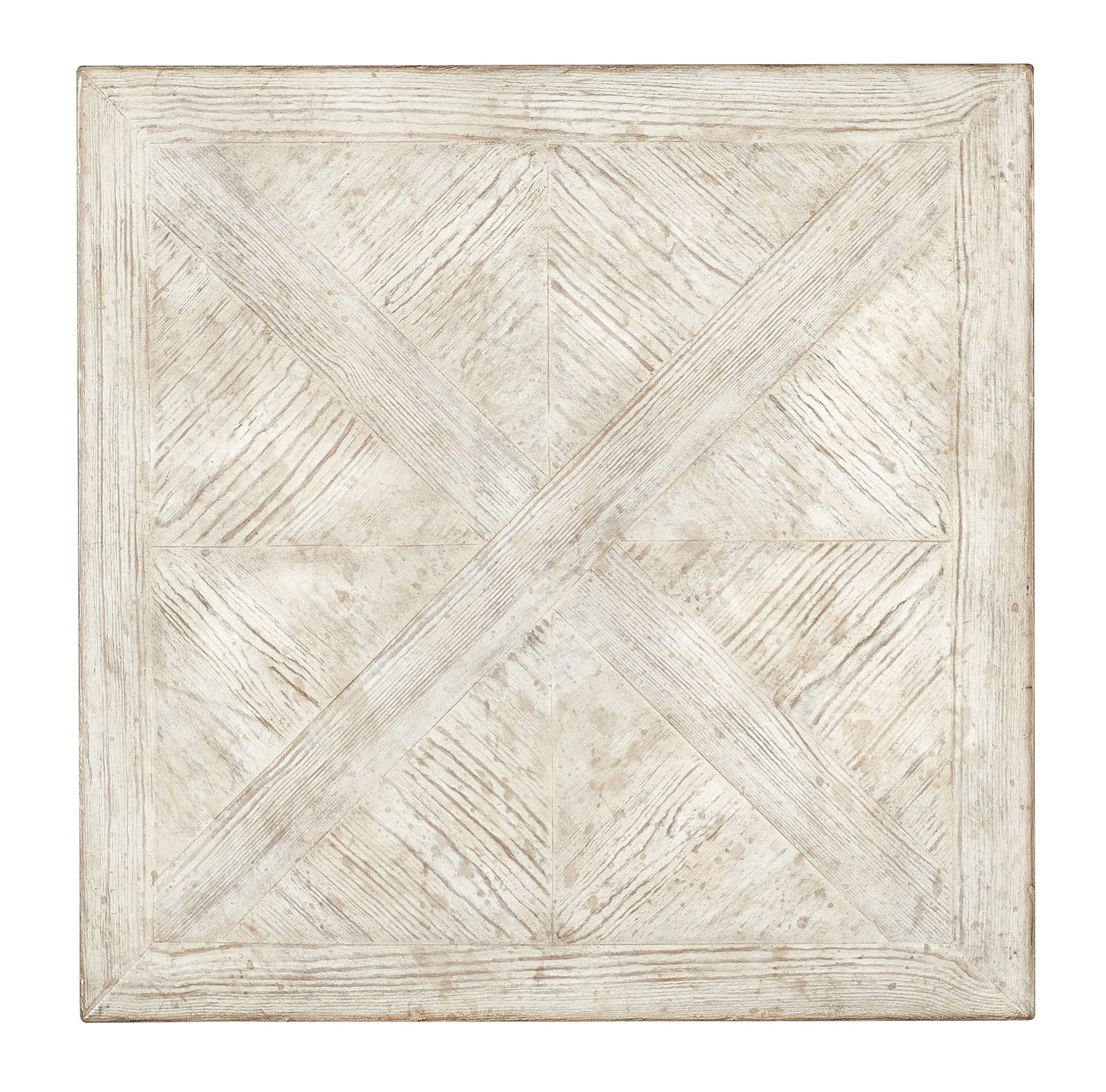 Block Buster Table is crafted of Pine with parquet-patterned veneers in a creamy white finish with rub-through and distressing and a plinth base.