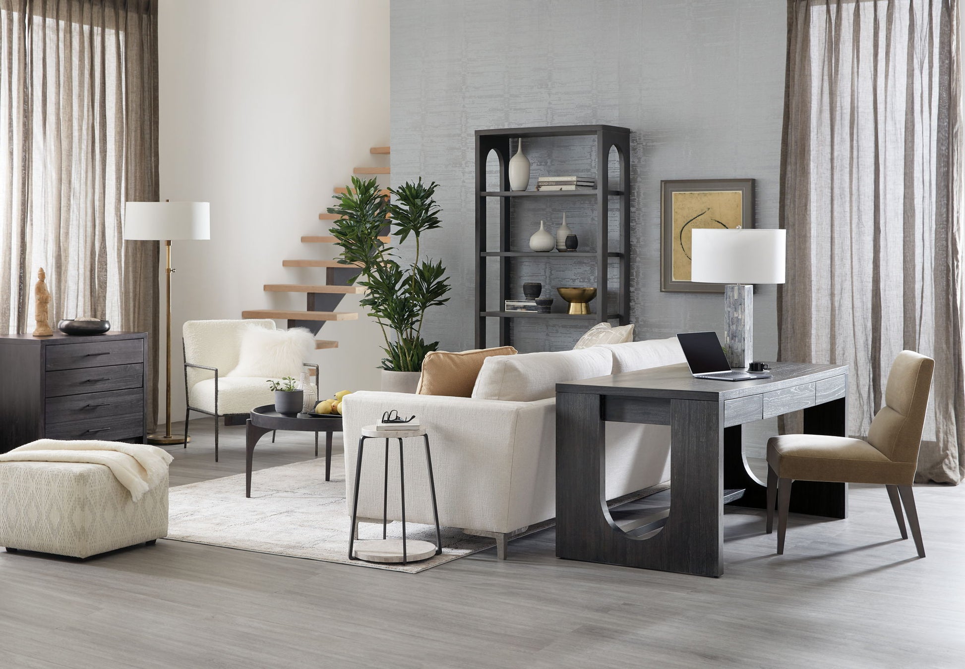 A casual finish over a rounded organic silhouette creates a striking design in the Commerce & Market Etagere. Crafted of Mindi Veneers, the etagere has 4 fixed shelves and features a black wood finish with wood grain showing through for a tactile appeal.