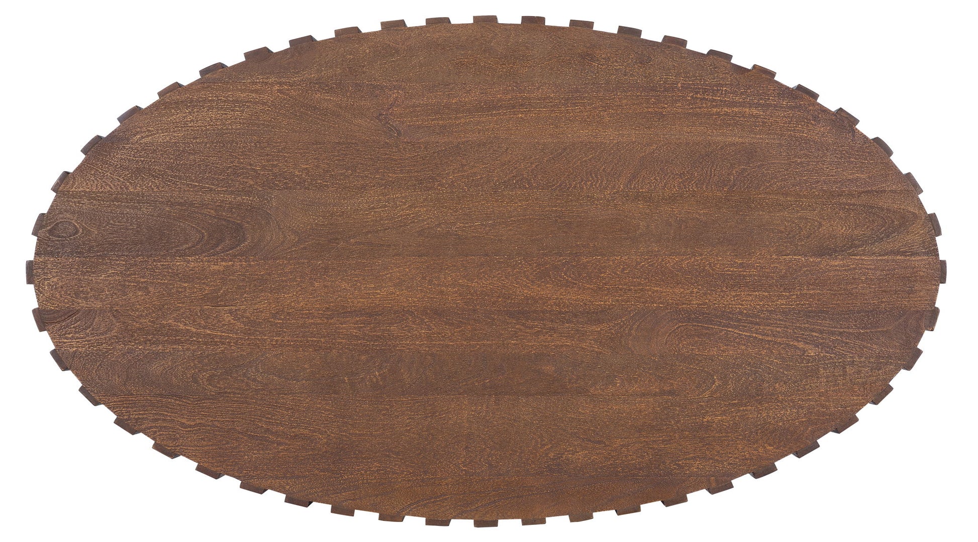 Industrial meets organic in the 58-inch wide oval Gears Cocktail Table, crafted of Mango Solids in a natural medium wood finish in a ribbed design in a gear motif.