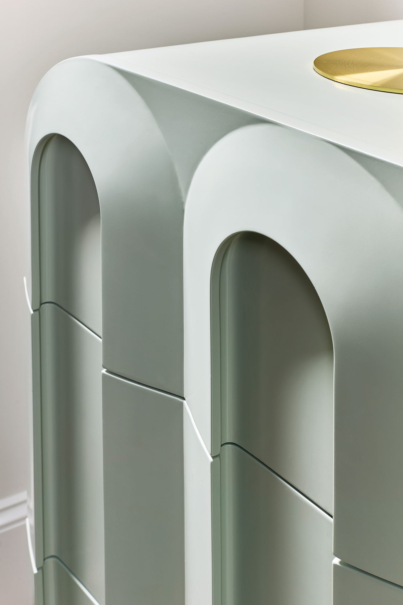 The Groove Three-Drawer Chest from the Commerce & Market collection is a striking storage solution, designed with modern elegance in mind. Made of white oak solids and oak veneers, it boasts a sculpted, grooved design on the front of its three spacious drawers. Painted in a blue-green seafoam color, this chest adds a pop of personality to any living room or bedroom. The plinth base provides a stable and contemporary foundation. Ideal for a modern or contemporary setting.
