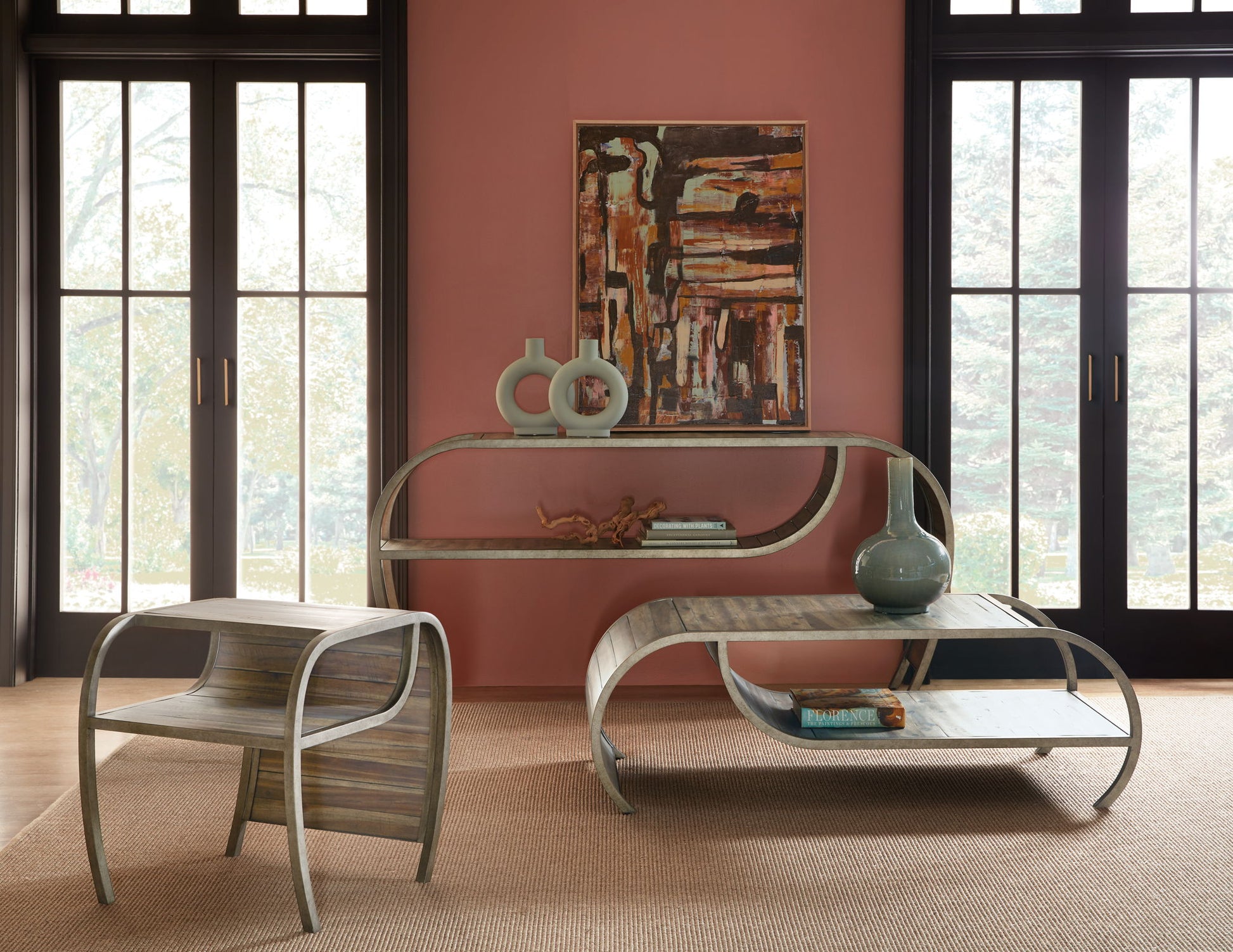 In a dynamic blend of shape and materials, the Open Ended Table combines a pewter metal frame with a planked-wood motif in a natural medium wood finish with distressing and visible knots. The curved design has one fixed shelf and measures 24 inches W by 22 inches D.
