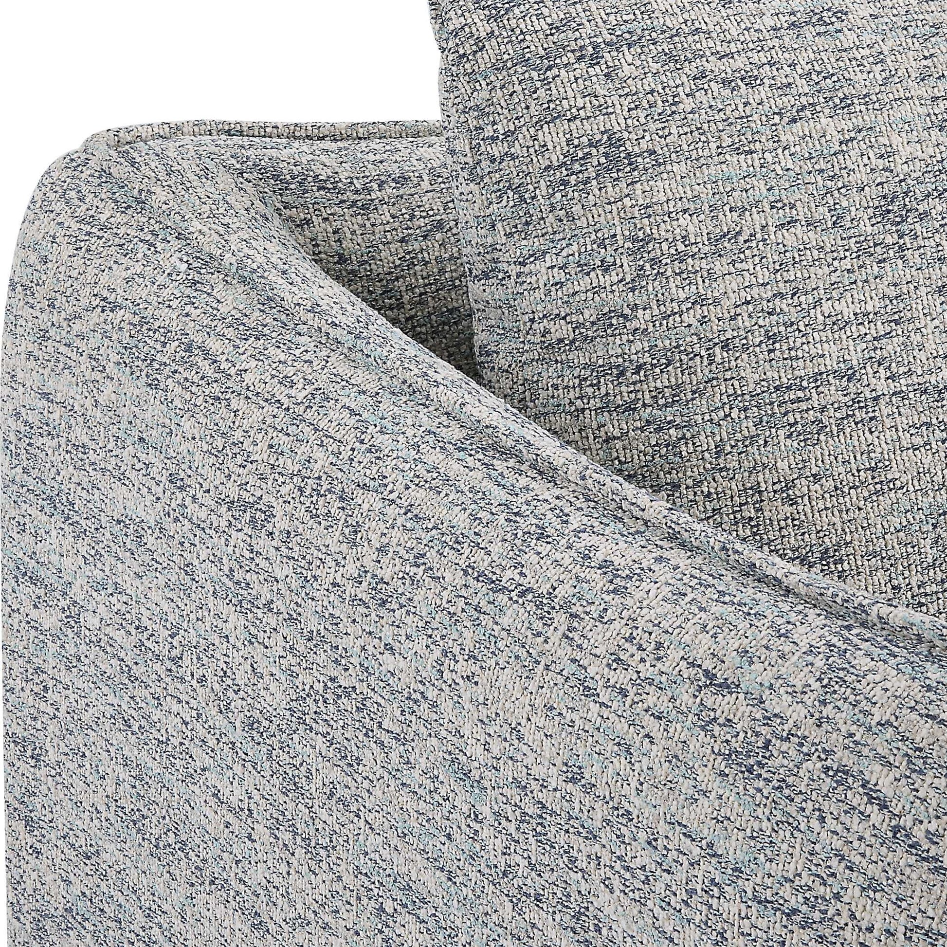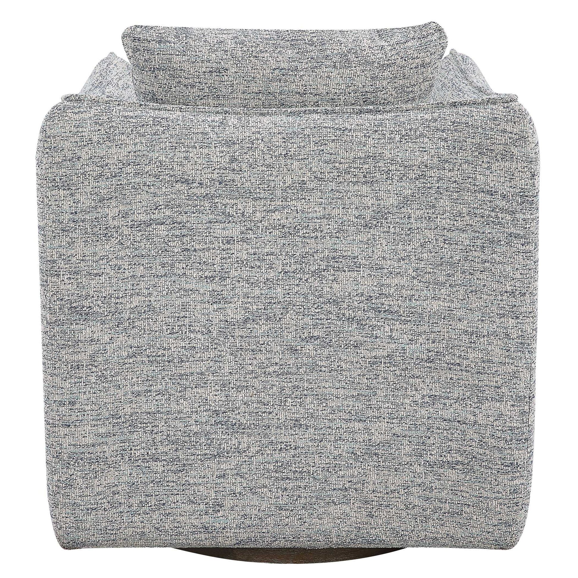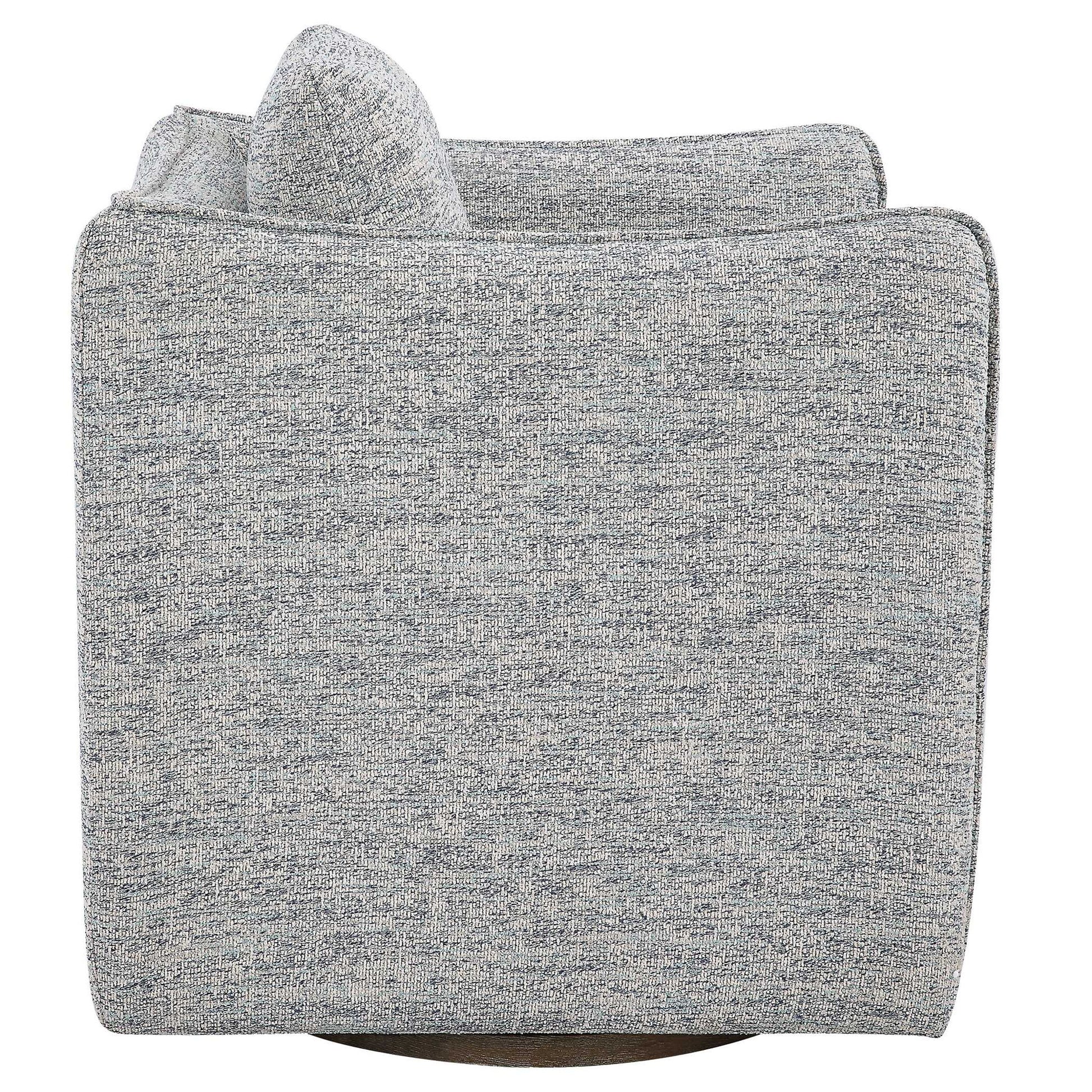 Casual Shelter Arm Accent Chair Tailored In A Casual Blue And White Tweed Fabric. Features A Flanged Edge Trim Complete With A Loose Back Pillow. Rests On A Solid Birch Wood Swivel Base, Finished In A Weathered Gray Stain.