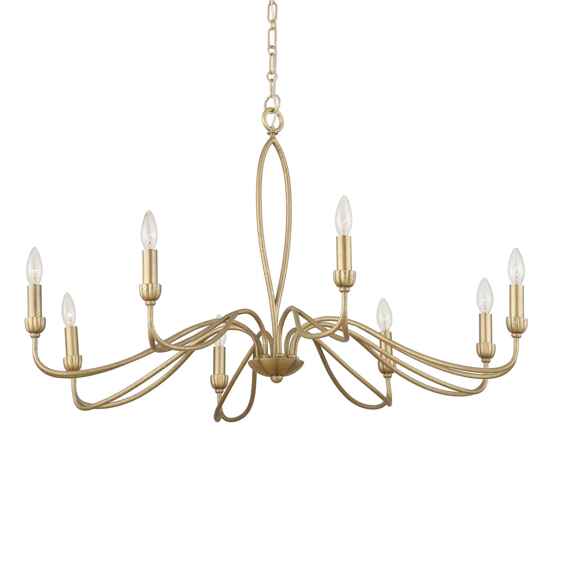 This Updated Traditional 8 Lt Chandelier Has Unique Marquise Shaped Petal Arms And A Matching Center Column. All Are Finished In A Textured Soft Gold That Refines This Look. 8-40 Watt Max Candelabra Sockets. Bulbs Not Included. Supplied With 20' Wire, 7' Decorative Link Chain For Adjustable Installation.