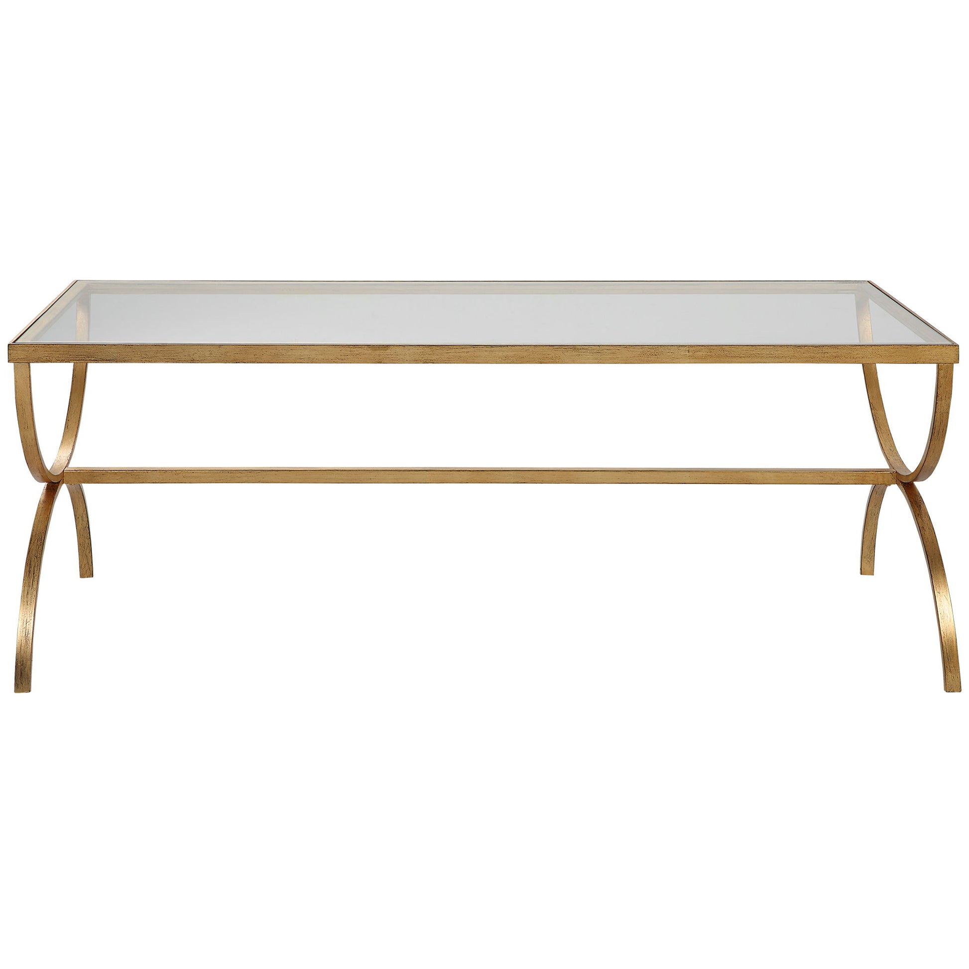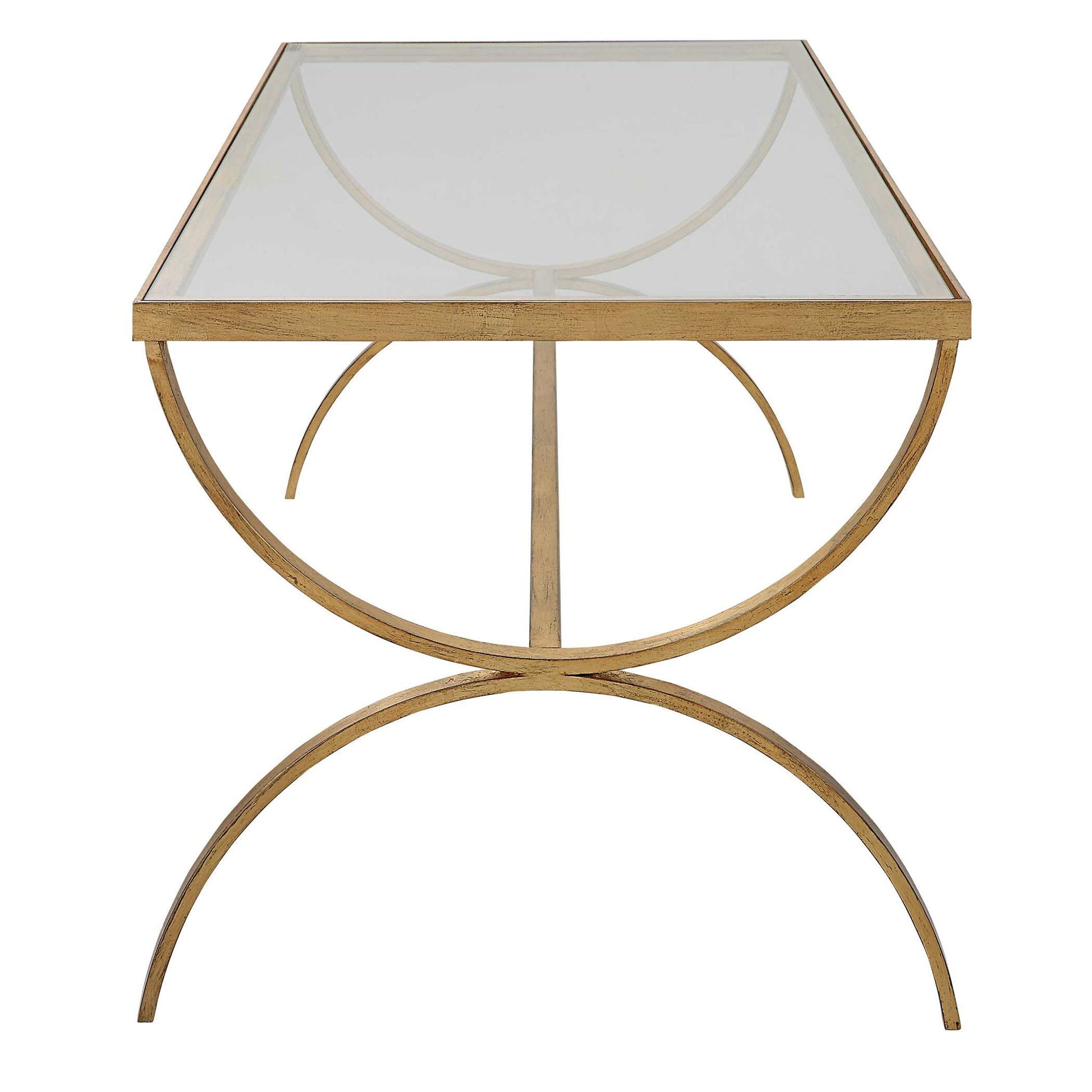 Traditionally Inspired, This Coffee Table Showcases Graceful Lines Constructed By Hand Forged Iron In An Antiqued Gold Finish With A Tempered Glass Top.