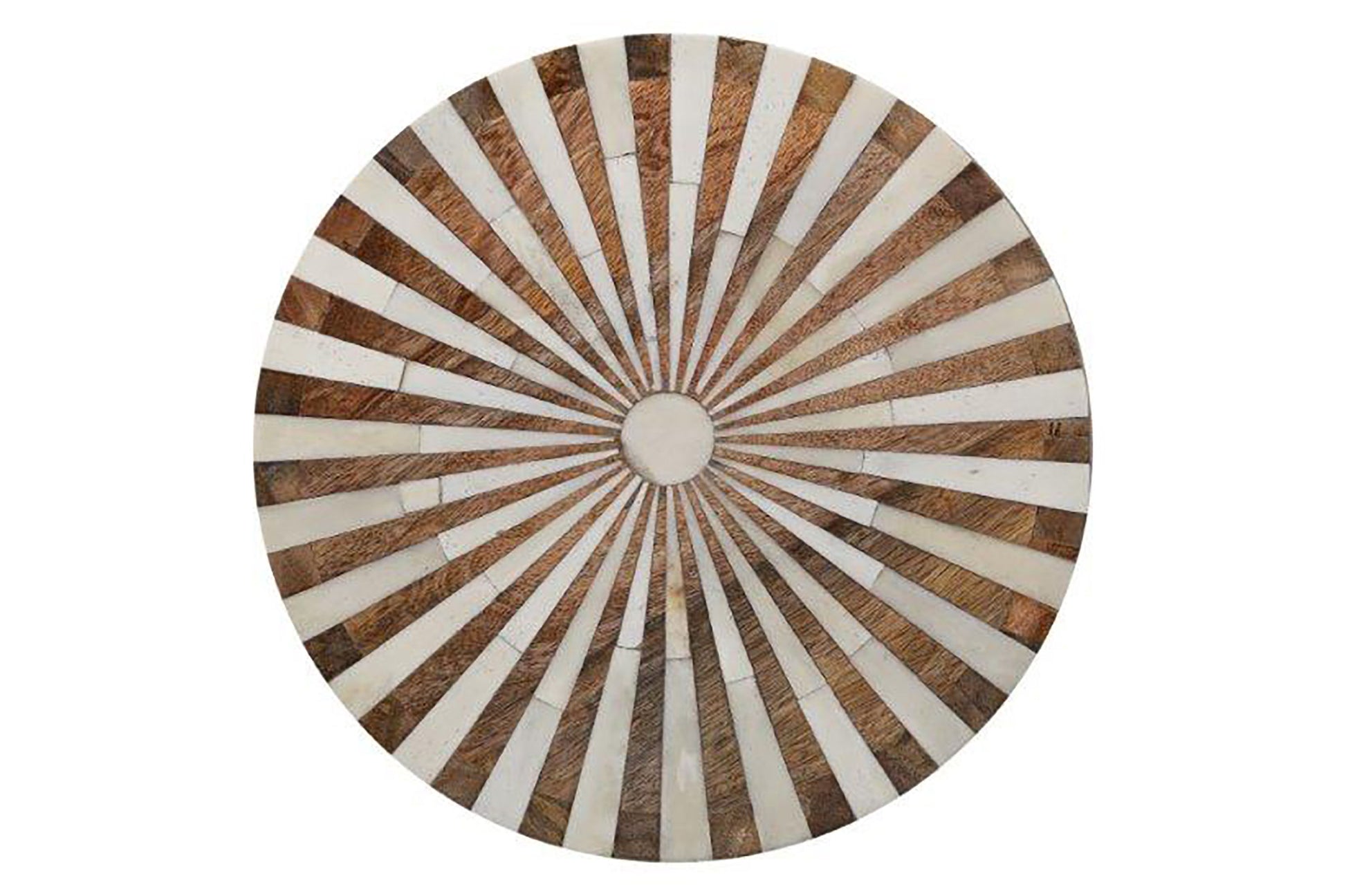 A natural fit for urban and suburban home décor, the Downtown round cocktail table offers a casual luxury with a youthful, slightly Boho vibe. Organic yet refined this 38 inch diameter table is made from mango wood and bone inlay in a beautiful radial pattern. Casters have been added for easy mobility.