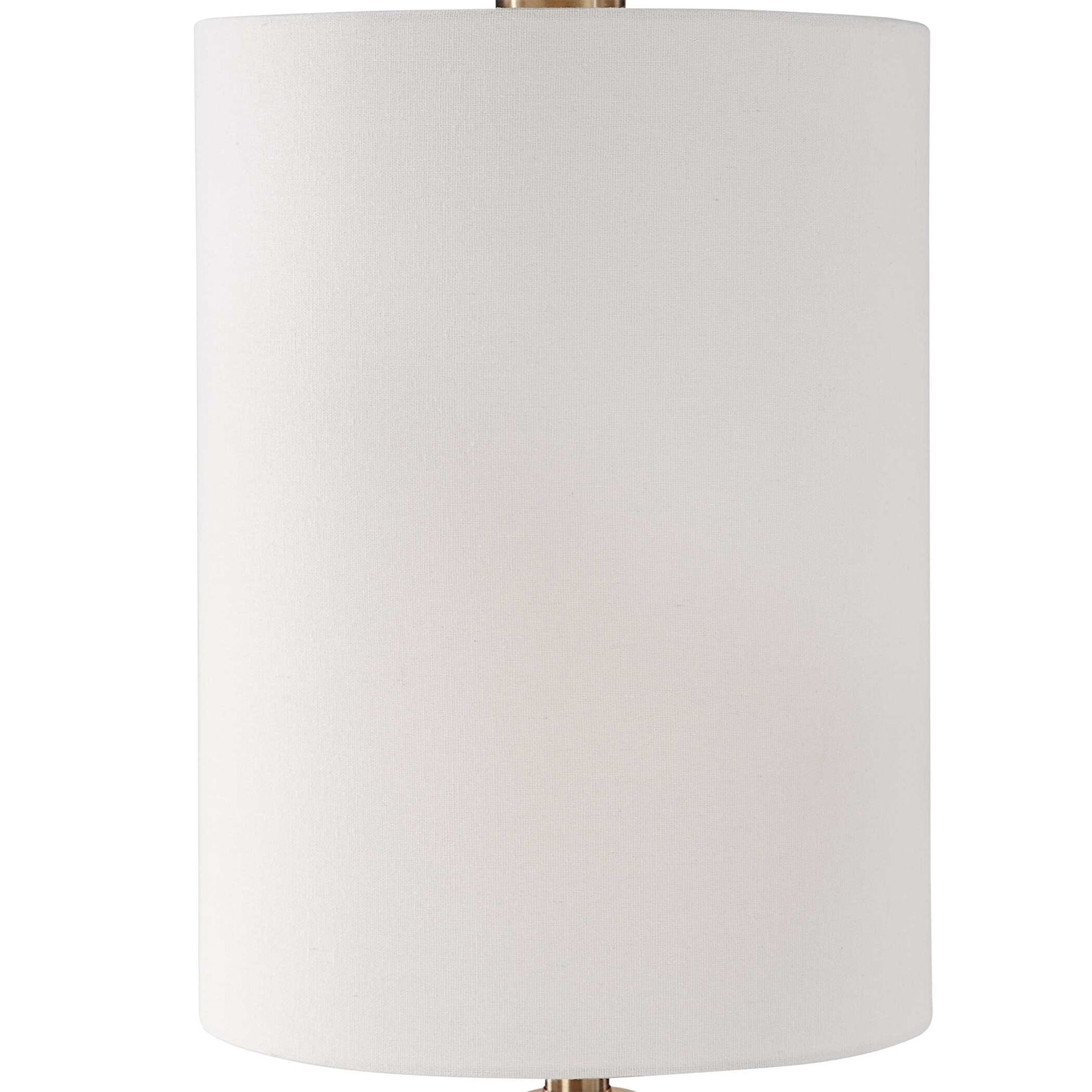 Finished In A Crackled Gray Glaze, This Ceramic Table Lamp Echoes Mid-century And Contemporary Styles. The Base Of This Piece Showcases An Embossed Repeating Geometric Design, Accented With Antique Brass Plated Details. The Round Hardback Shade Is A White Linen Fabric With Natural Slubbing.