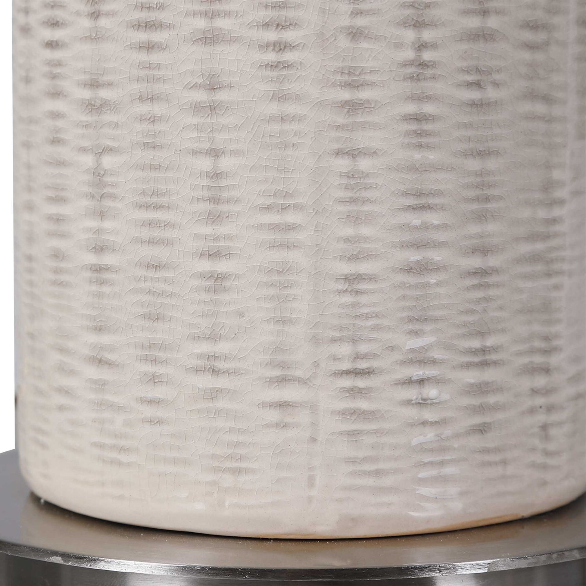 This Ceramic Base Keeps It Simple, Yet Upscale With A Fashionable Pattern Finished In A Distressed Light Gray Glaze, Paired With Brushed Nickel Plated Accents. The Hardback Drum Shade Is Light Gray Linen Fabric.