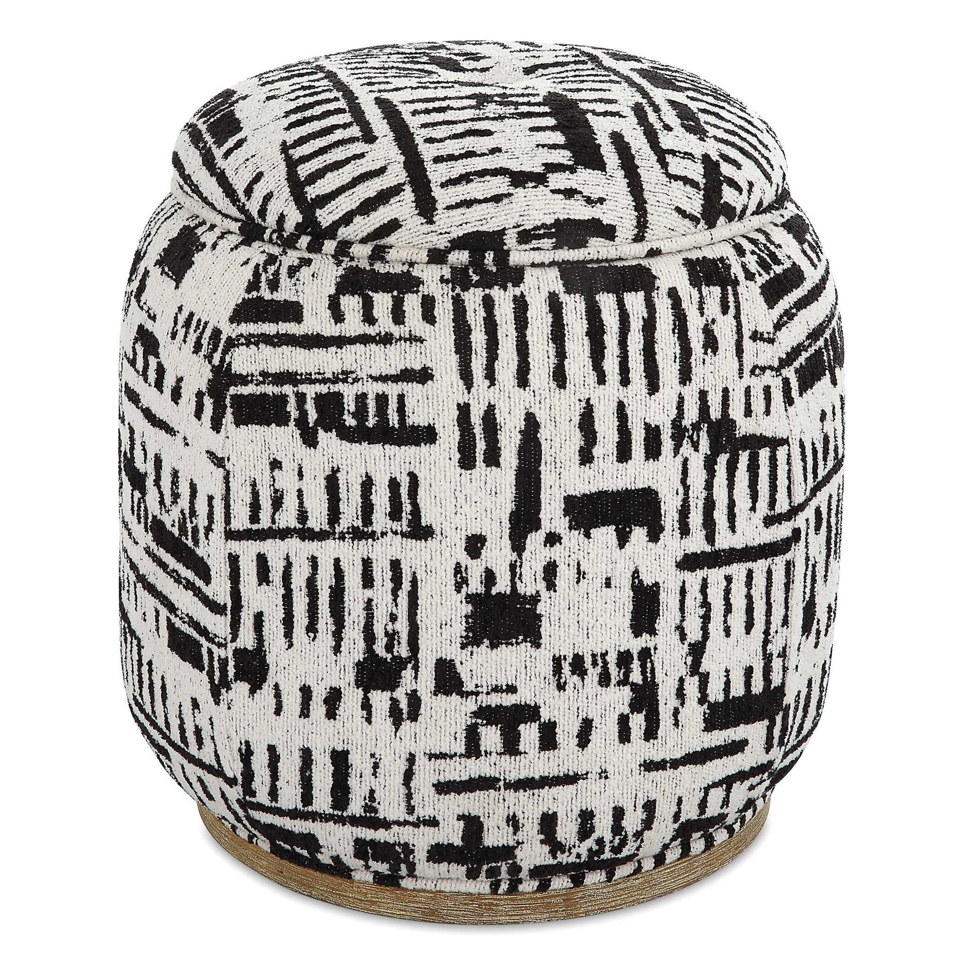 A Statement Abstract Also Acting As A Neutral, The Dialogue Accent Stool Features A Black And Off White Pattern Over An Oak Finished Solid Wood Base With Beige Ceruse. Top Is Removable For Extra Storage.