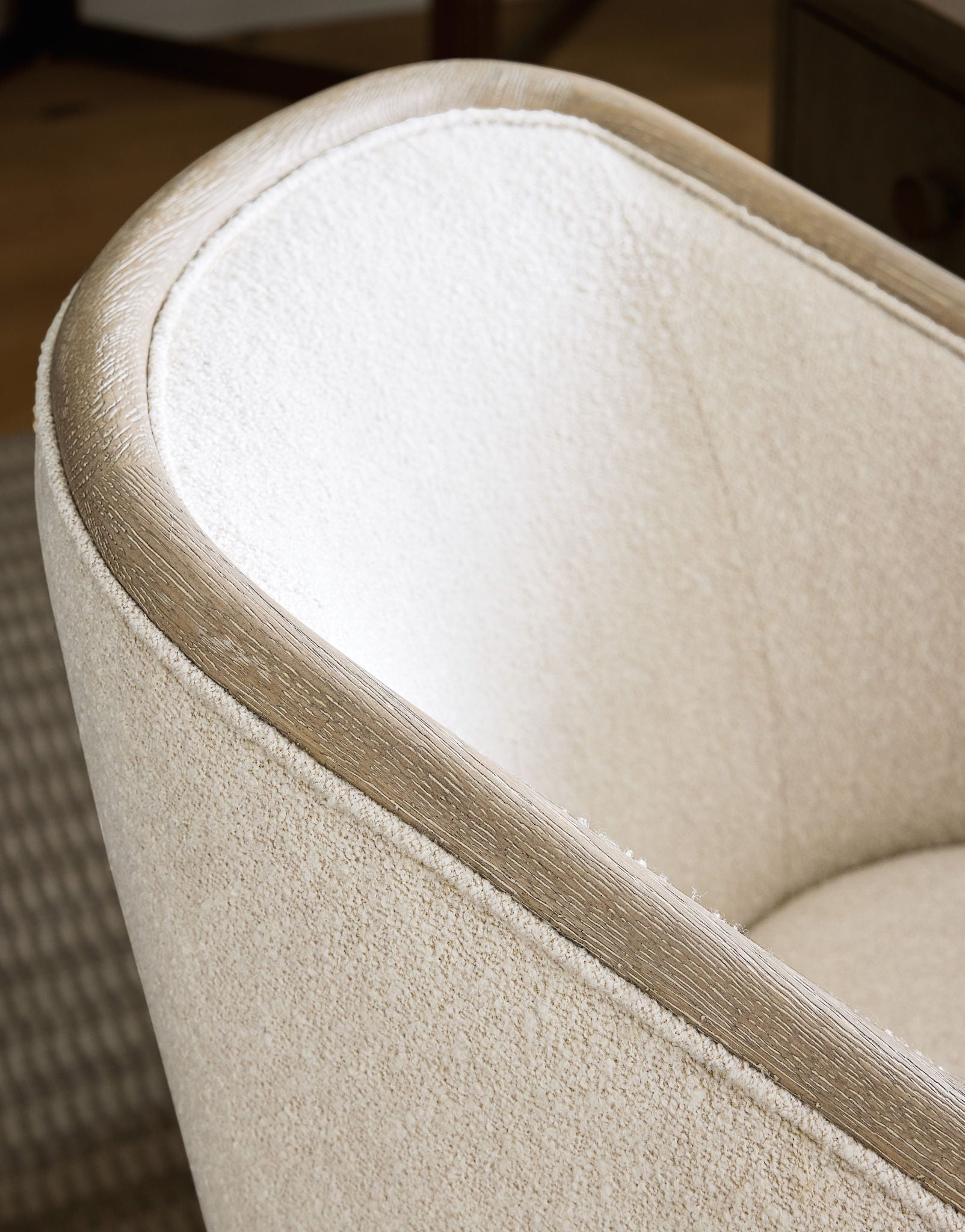 Discover the Paloma Executive Swivel Tilt Chair in the timeless, designed by Hooker Upholstery for contemporary home office spaces. Featuring a barrel back design this chair exudes a classic aesthetic. Upholstered in fabric with easy-care properties, it offers adjustable height, swivel motion, and a sturdy wood trim and base. Ideal for professionals seeking comfort and style in their home workspace setup.