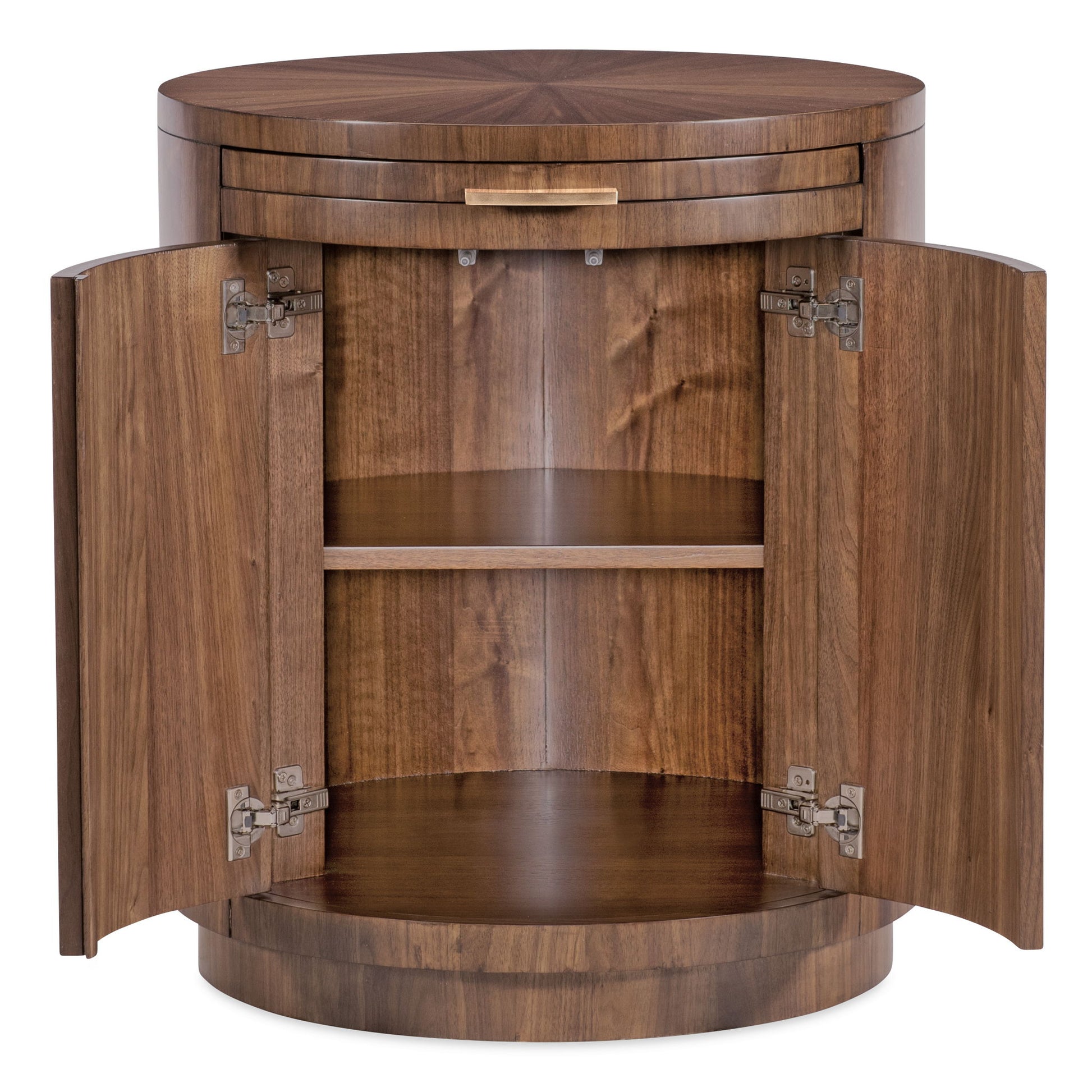 The Eleana Round Nightstand features a beautiful starburst veneer top, touch-latch wood doors, and a pull-out tray for added versatility. Finished in Light Caramel walnut veneers with Sunlit Bronze hardware, this piece is perfect for adding warmth and luxury to any bedroom.