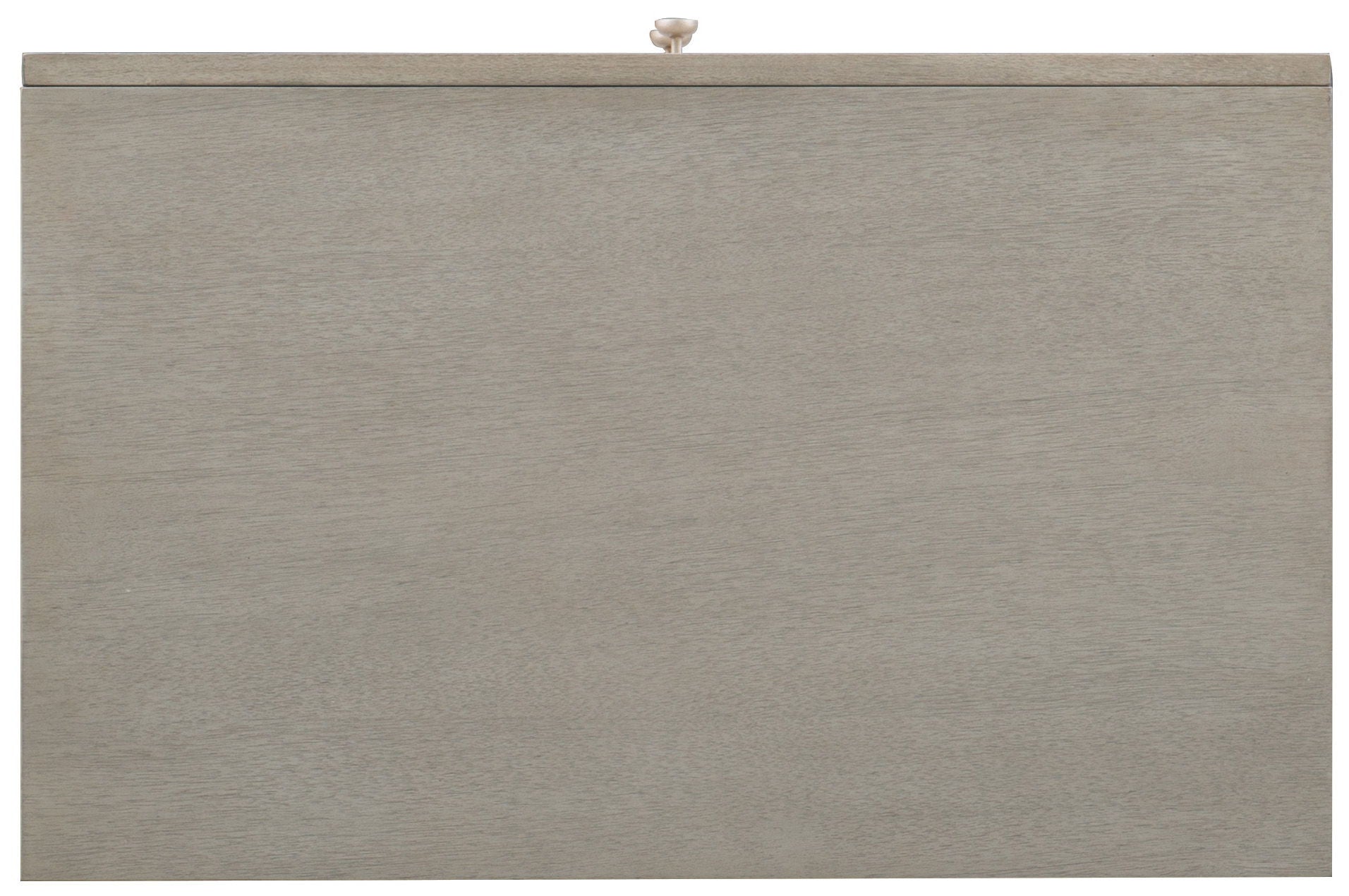 Curvy and elegant, the Elixir Two-Drawer Nightstand combines metal trim and a metal X-stretcher in a champagne silver finish with a serene gray beige finish applied to lightly sand-blasted walnut veneer for textural appeal.