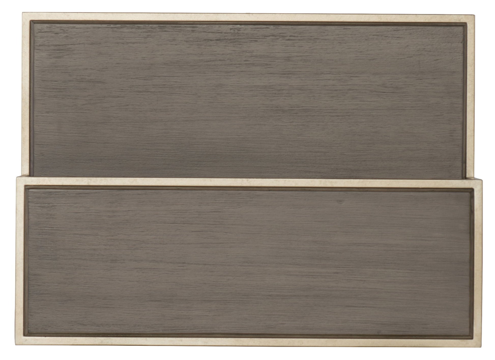 The delicately-scaled Elixir Leg Nightstand combines metal elements in a champagne silver finish with a soft gray finish applied to lightly sand-blasted walnut veneer for an organic and textured look. One drawer and two shelves. Faux shagreen is on the knob for a touch of intrigue.