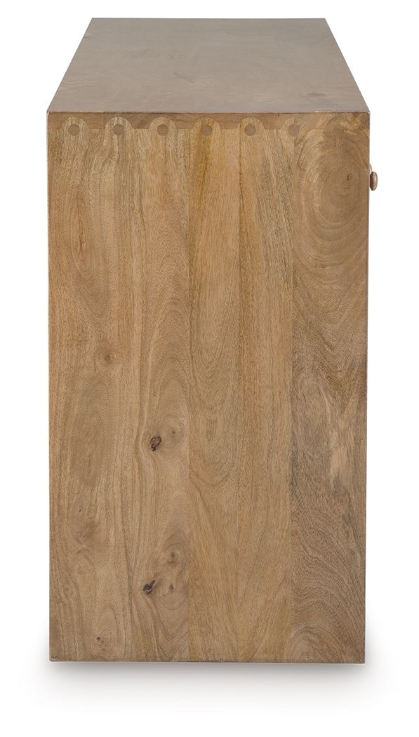This console table takes casual design to a whole new level. Solid mango wood is adorned with a multi-step light brown finish that enhances its natural character. Clean, contemporary lines are paired with an attractive peg and dovetail detail for a unique artistic style, keeping this piece on the cutting edge of cool. Two double-door cabinets with coordinating knobs are perfect for storing your small items neatly out of sight.