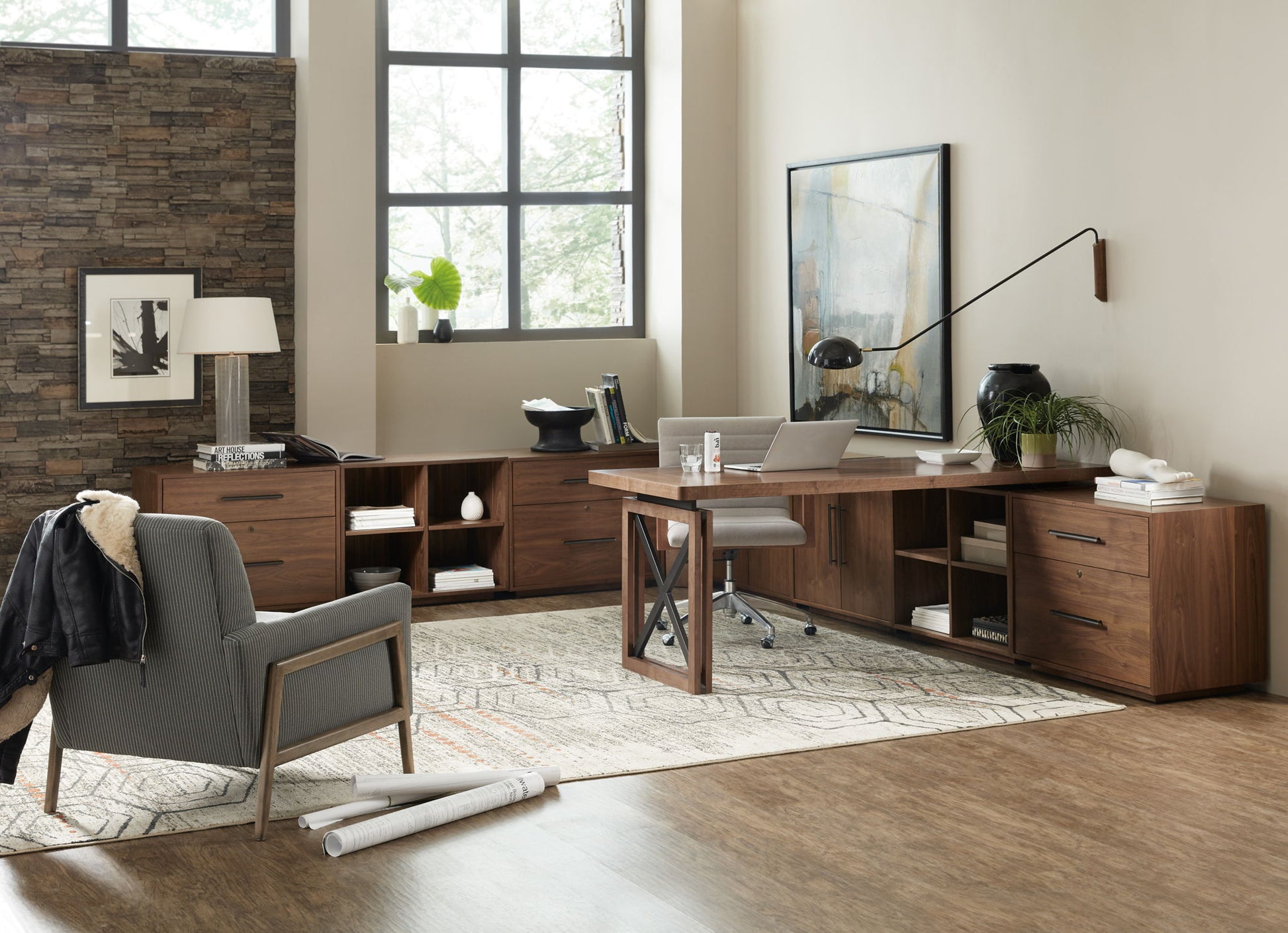 With a craftsman flair and quality, the Elon Lateral File is crafted of Flat Cut Walnut Veneers with a satin medium wood finish and dark bronze metal bar pulls. The top drawer is a utility drawer, while the bottom drawer is a locking file drawer with pendaflex letter/legal filing system. Can be bunched with other 1650 Elon office items for a modular configuration or used alone.